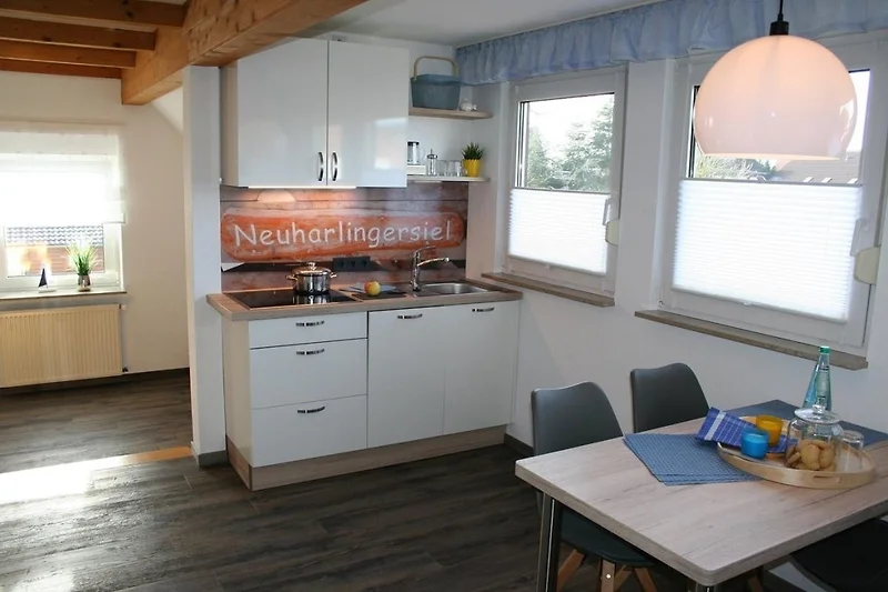 Das weisse Ferienhaus mit dem grossen Garten und drei gemütlich eingerichteten Ferienwohnungen ist in einer ruhigen Wohnsiedlung, ca. 150 m hinterm Deich und ca. 250 m vom historischen Kutterhafen – dem Herzstück Neuharlingersiels – entfernt. Die Ferienwohnung im 1. OG ist der ideale Ausgangspunkt für schöne Radtouren am Deich.