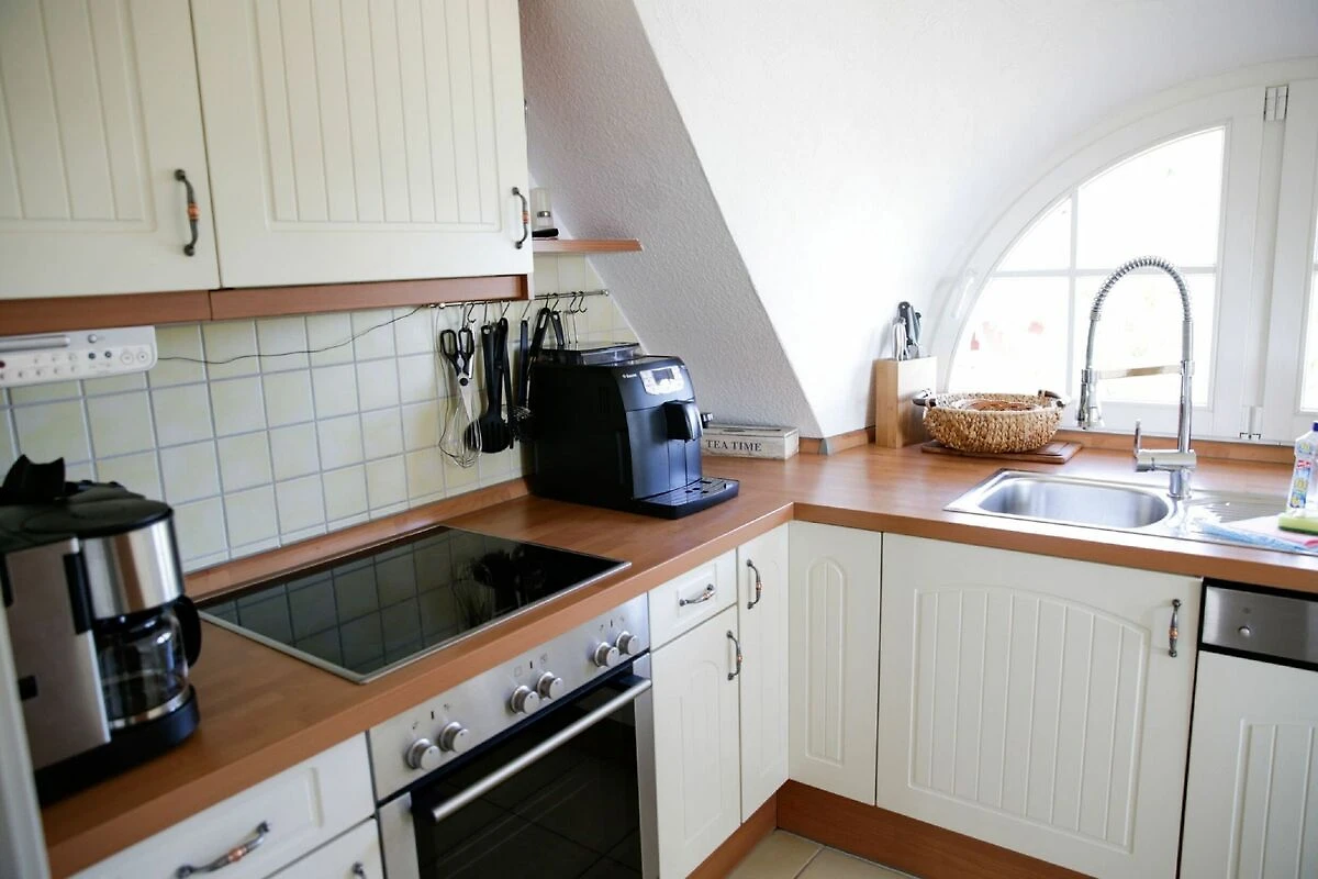 KÜCHE // offen zum Wohnraum Küchenzeile, Ceranfeld, Spülmaschine, Kühlschrank mit Gefrierfach, Backofen, Toaster, Wasserkocher, Kaffeevollautomat, reichlich Besteck, Geschirr und Küchenutensilien ++