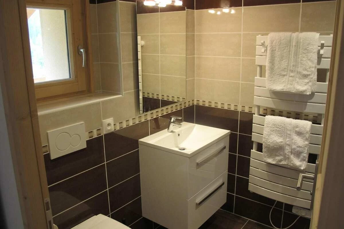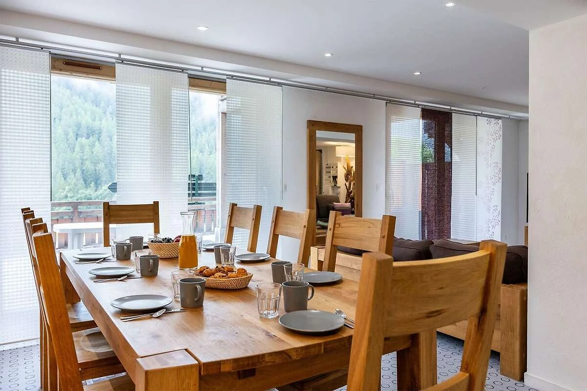 Dieses Appartment über 2 Etagen bietet eine außergewöhnliche Aussicht auf das Tal von Nancroix, die Berge, Fichtenwälder und das Massif de la Vanoise. Vom großen Wohnbereich mit offener Küche führt eine Treppe zu den drei Schlafräumen, jeder mit privatem Bad.