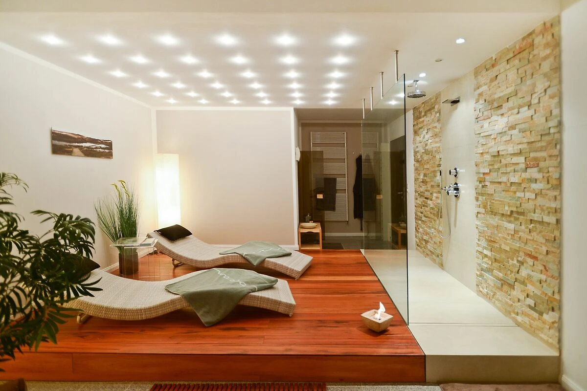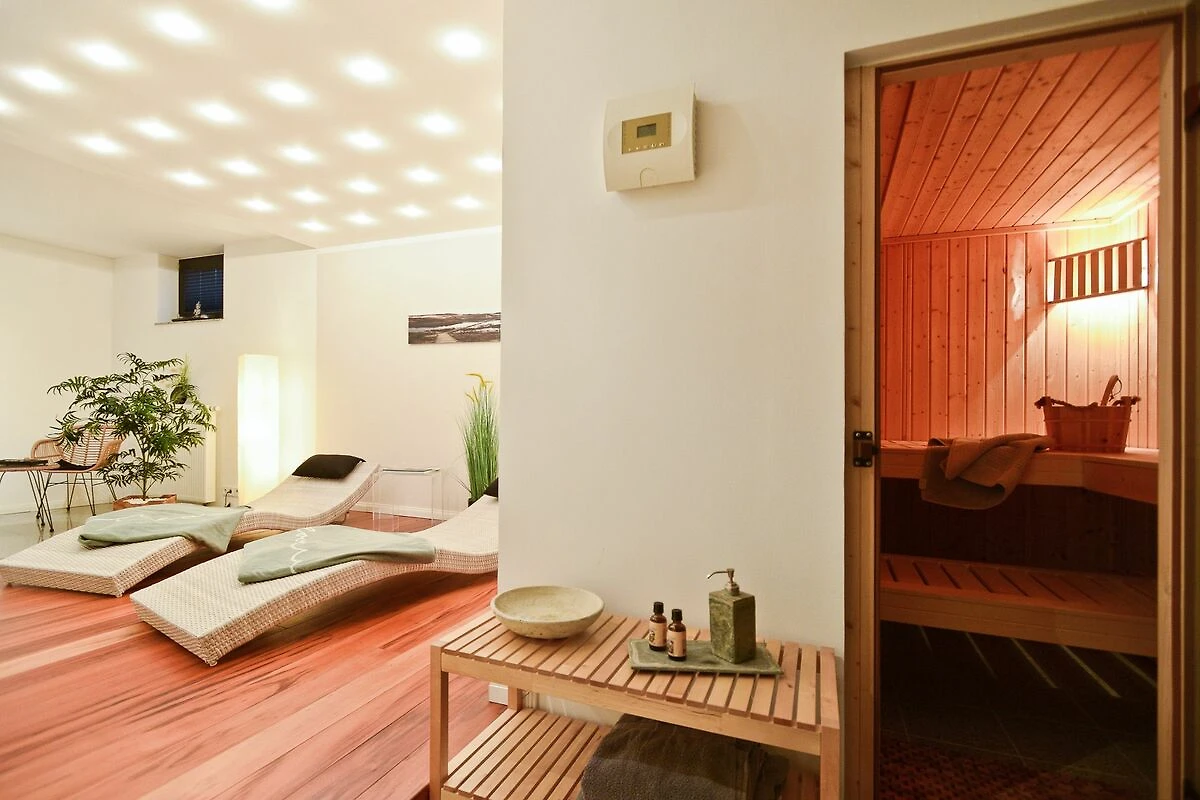 UG: stimmungsvoller Wellnessbereich mit Sauna und Dusche (Sauna-Handtücher einmalig pro Person inkl.), Schlafzimmer "4" mit Doppelbett (1,40 x 2,00 m; eine Matratze), Waschmaschine, Kinderreisebett (ohne Matratze) und Hochstuhl, überdachte Terrasse, Garten mit Gasgrill und Feuerpilz sowie einer Außendusche, zwei Parkplätze, Bettwäsche und Handtücher einmalig pro Person inklusive.
