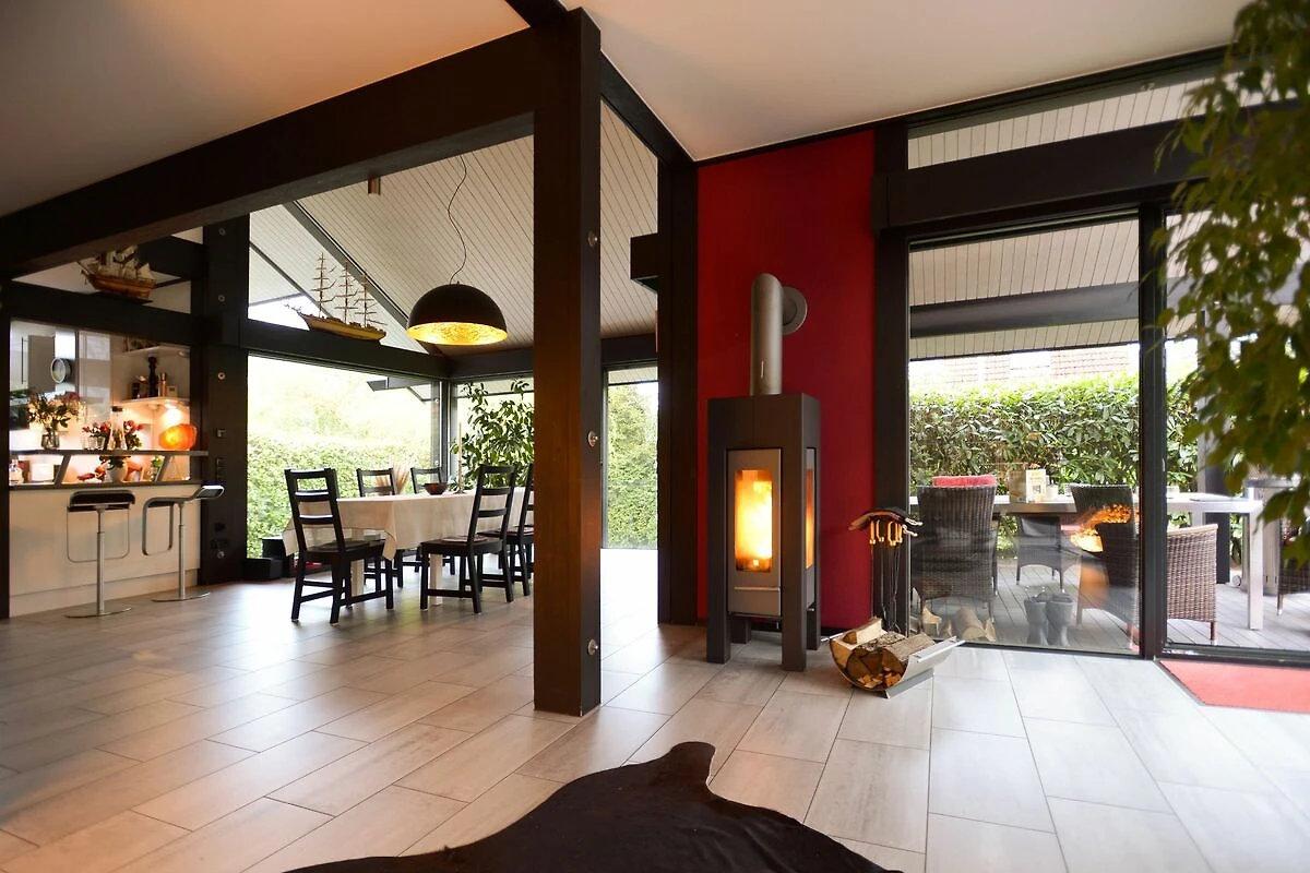 EG: Esszimmer mit offener Küche, Backofen, Mikrowelle, Kühlschrank mit Gefrierfach, Geschirrspüler, großes Wohnzimmer mit Kamin, Smart TV, Stereo-Anlage, Schlafzimmer "1" mit Doppelbett (1,40 x 2,00 m) mit eigenem Badezimmer Dusche /WC und begehbarem Kleiderschrank, Gäste WC,