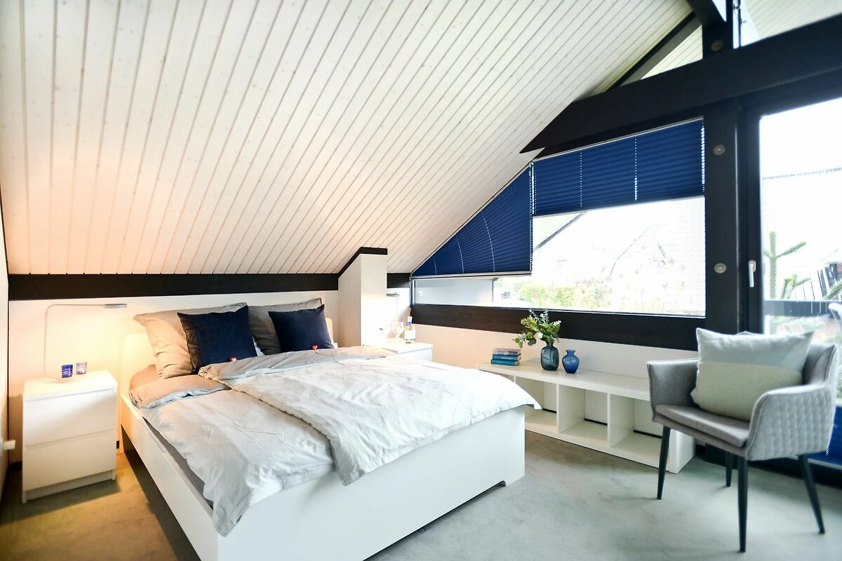 1. OG: Schlafzimmer "2" mit Doppelbett (1,40 x 2,00 m; eine Matratze), Schlafzimmer "3" mit Doppelbett (1,60 x 2,00 m; eine Matratze) mit TV, Badezimmer mit Badewanne / WC, Arbeitszimmer, separates Zimmer mit Schlafcouch, 2 Balkone,