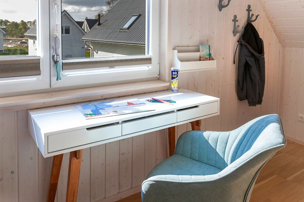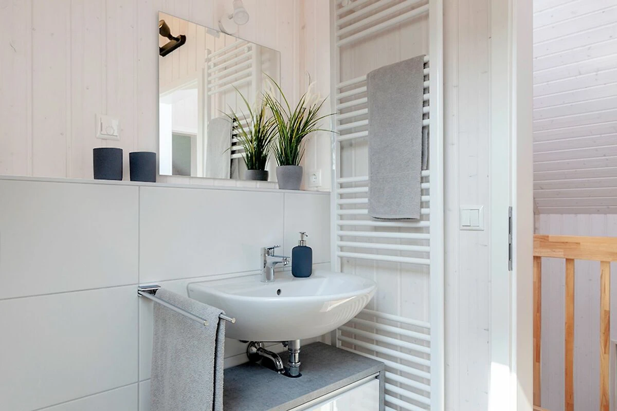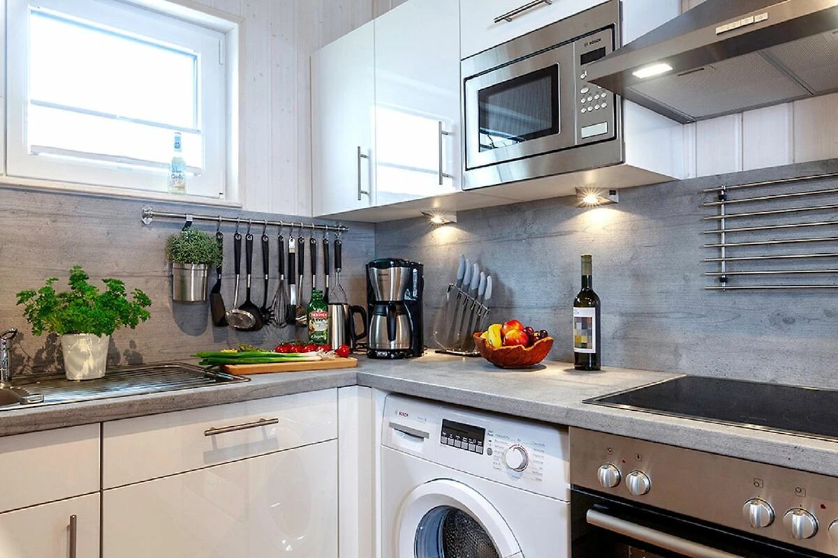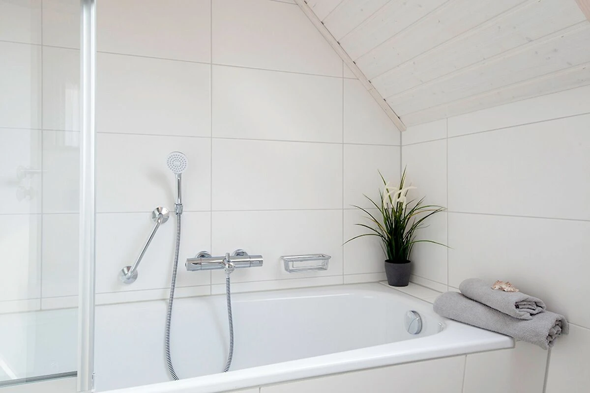 Willkommen im Haus "Maranatha" in Olpenitz. Das Ferienhaus besticht durch seine hochwertige, liebevolle Einrichtung sowie der unmittelbaren Nähe zur Ostsee. Die großen Fenster sorgen für ein lichtdurchflutetes großzügiges Wohngefühl. Es verfügt über einen offenen Wohn- und Essbereich, eine Küche, zwei Schlafzimmer und zwei Bäder. Nach langen Strandspaziergängen können Sie auf dem gemütlichen Sofa vor dem Kamin entspannen und Ihre Lieblingsserie auf dem Flachbild-TV schauen. Das Sofa kann zu einer Schlafcouch (170x190cm) ausgezogen werden und eignet sich als Schlafmöglichkeit für zwei Kinder. Für die Kleinen steht ein Kinderhochstuhl bereit. Die voll ausgestattete Küche bietet alles, was Sie für einen geselligen Kochabend mit der Familie benötigen. Im ersten Obergeschoss befinden sich die zwei Schlafzimmer. Das eine ist mit einem Doppelbett (180x200cm) und einem Flachbild-TV ausgestattet, das andere verfügt über zwei Einzelbetten (je 90x200cm). Beide Schlafzimmer sind mit jeweils mit einem Kleiderschrank und Verdunkelungsmöglichkeiten ausgestattet, sodass einem erholsamen Schlaf nichts mehr im Wege steht. Ein Badezimmer befindet sich im Erdgeschoss und ist mit einer ebenerdigen Dusche und dem Highlight: einer Infrarot-Sauna ausgestattet. Hier können Sie sich an kalten Tagen aufwärmen und entspannen! Das andere Badezimmer befindet sich im Obergeschoss und bietet eine Duschwanne und einen Föhn. An sonnigen Tagen können Sie es sich auf der möblierten Terrasse gemütlich machen. In dem Strandkorb können Sie ihre Urlaubstage genießen und an lauen Sommerabenden mit der Familie die Tage auf der Terrasse ausklingen lassen. Das Ferienhaus ist für maximal vier Erwachsene und zwei Kinder vorgesehen. Ihre Fellnasen können Sie gerne mitbringen! Für Ihren PKW ist ein Stellplatz vor dem Haus zur Verfügung. Im abschließbaren Fahrradschuppen können Sie Ihre mitgebrachten oder ausgeliehenen Fahrräder sicher abstellen. Das Haus ist für 4 Erwachsene und 2 Kinder geeignet.