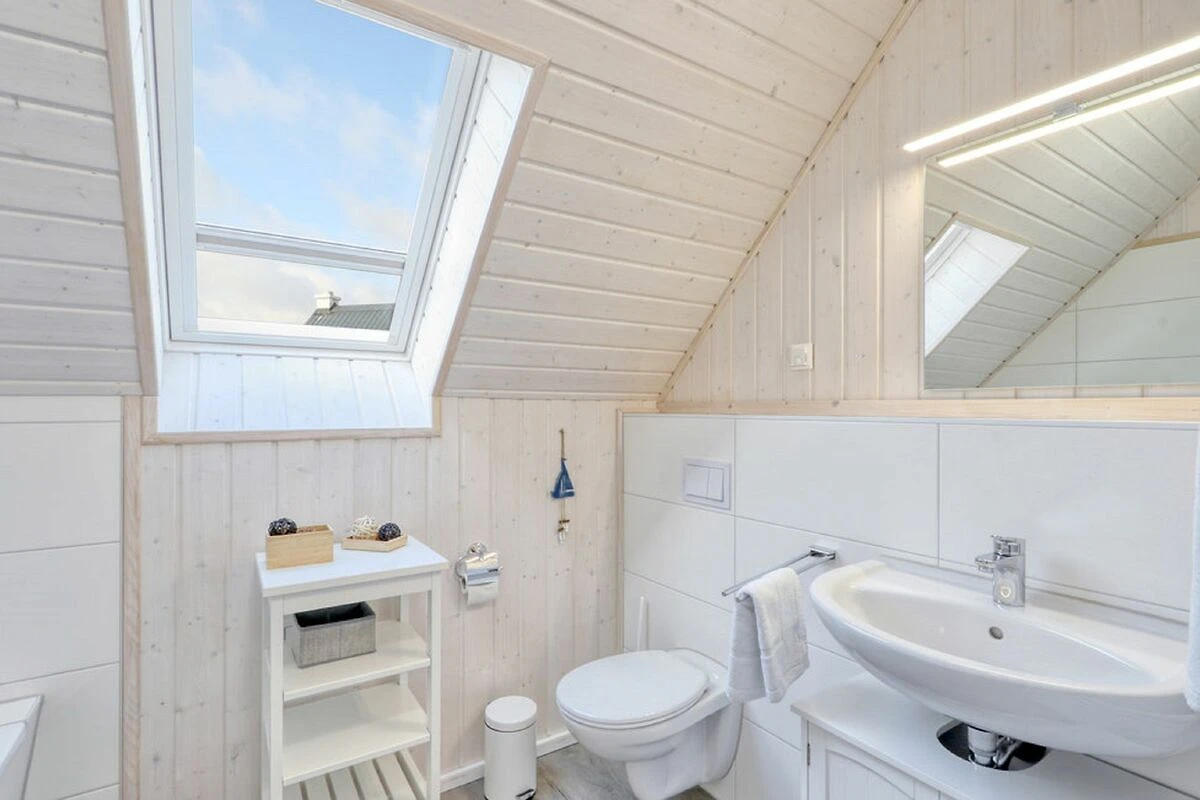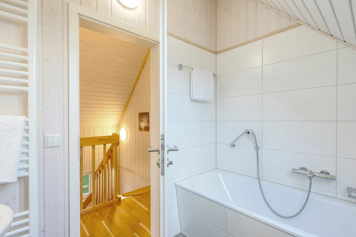 Das großzügige Badezimmer im Erdgeschoss ist mit einer ebenerdigen Dusche und als besonderes Highlight mit einer Infrarot-Sauna ausgestattet – ideal, um sich an kühleren Tagen wohlig aufzuwärmen. Im Obergeschoss bietet das zweite Badezimmer eine bequeme Badewanne und mit Duschmöglichkeit und einem Föhn.