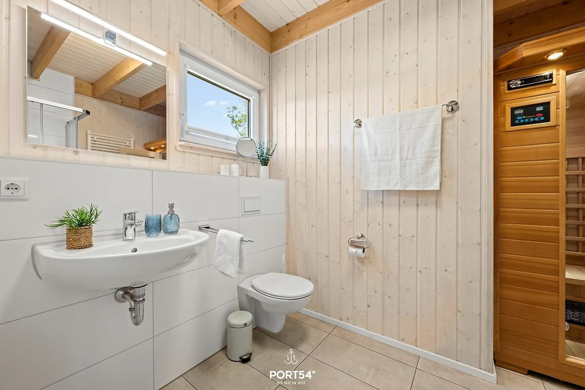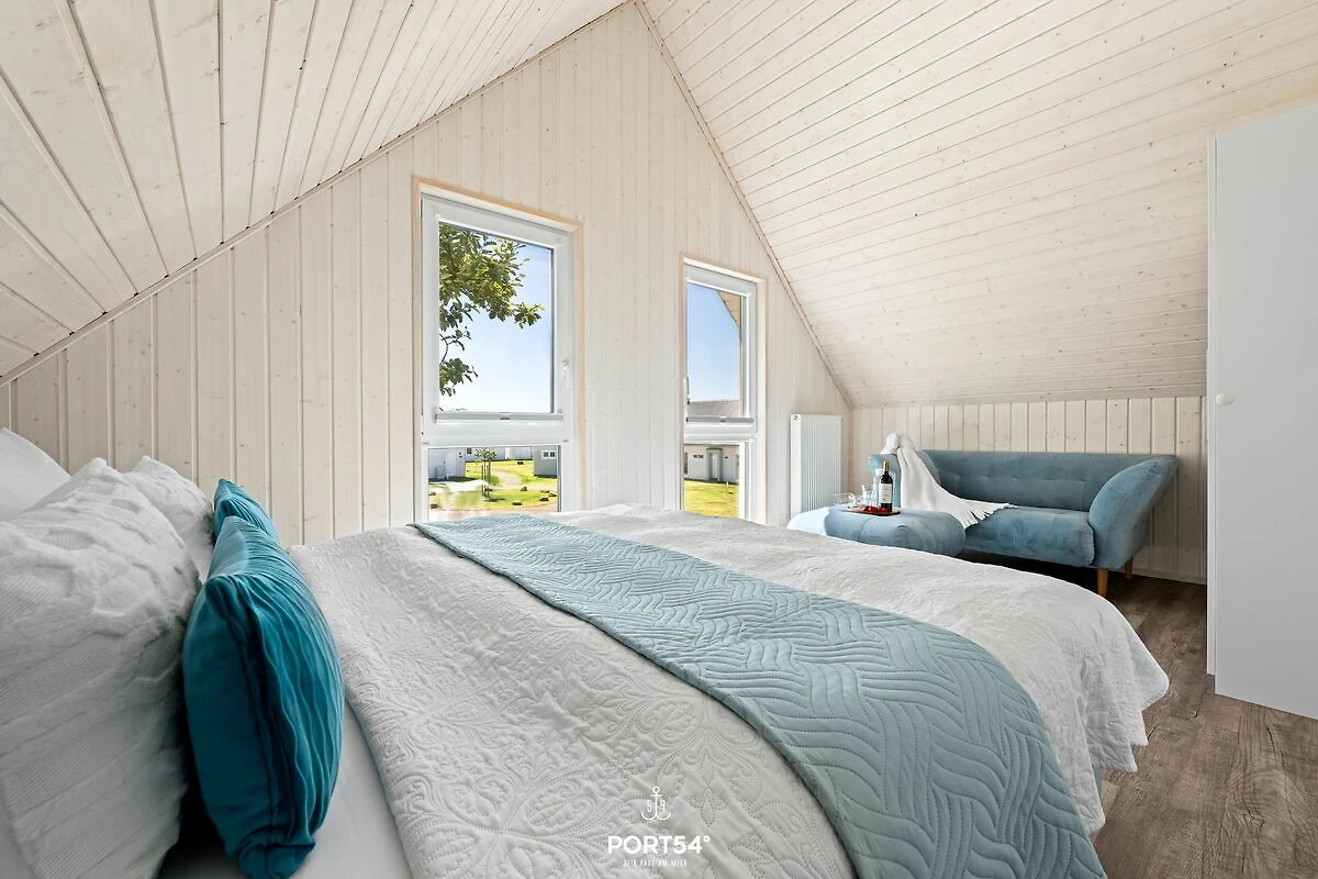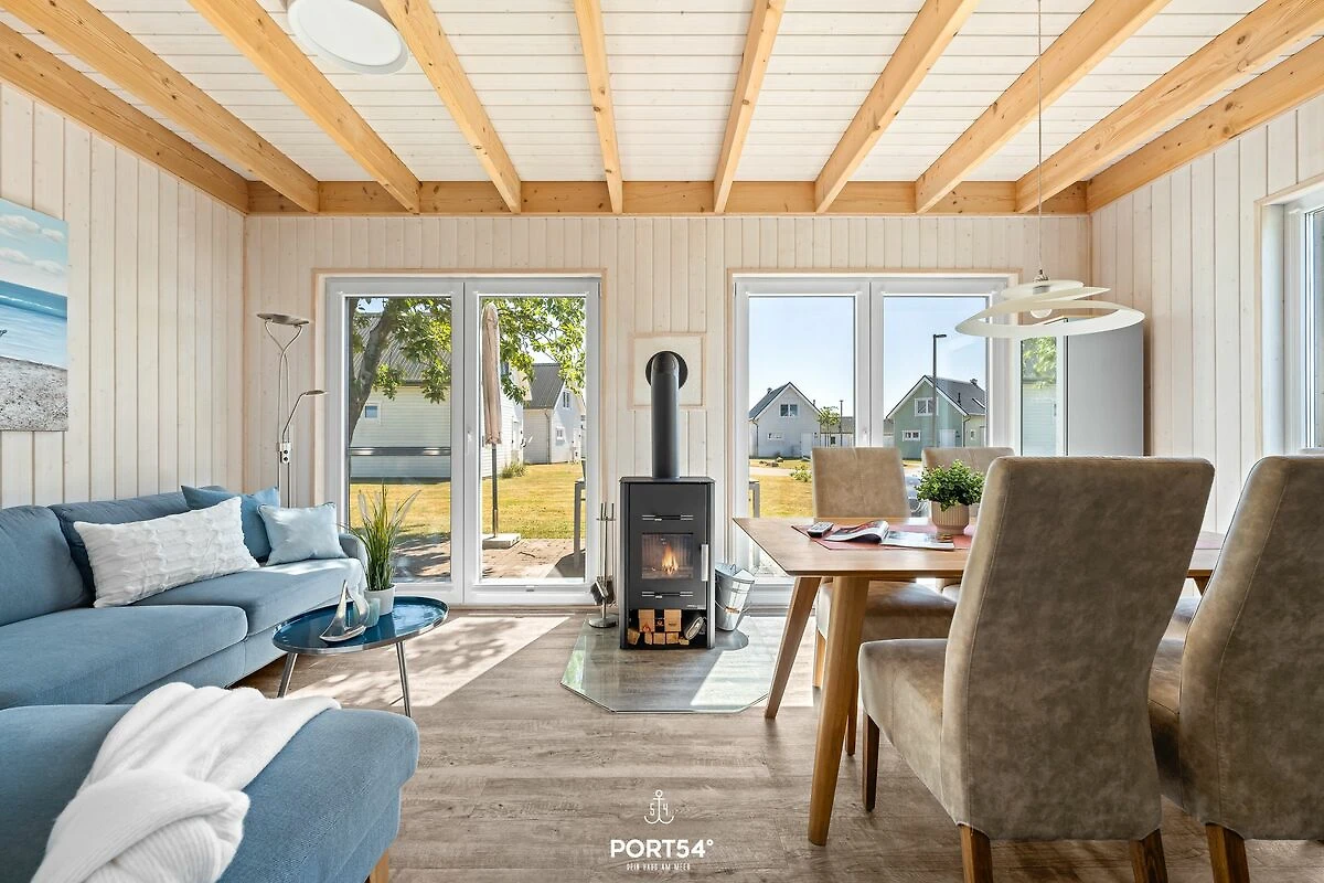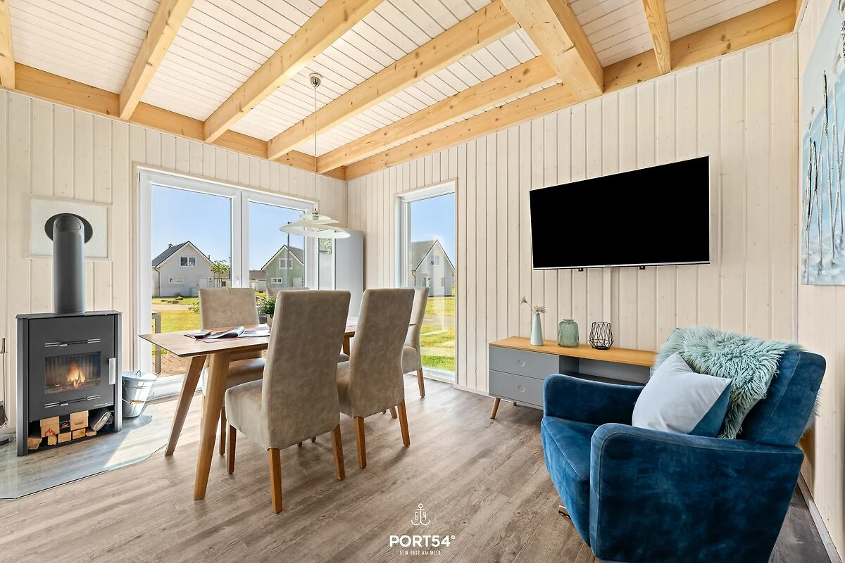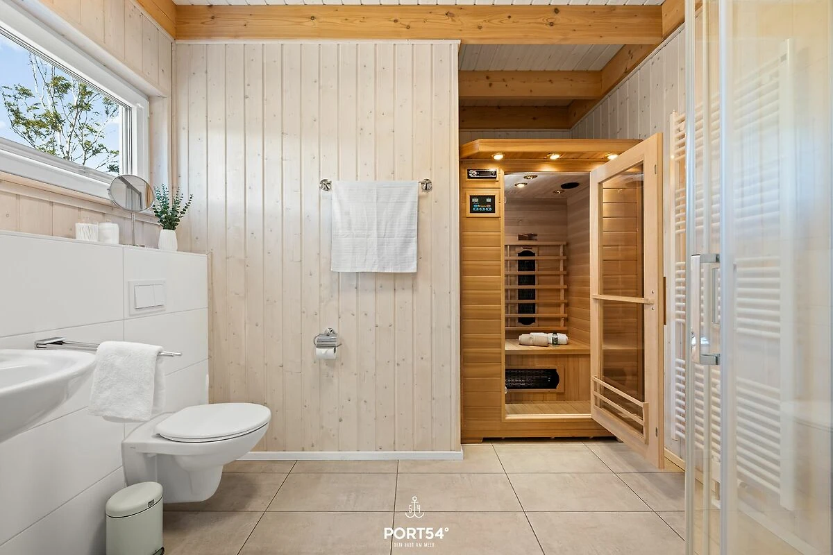 Herzlich Willkommen im "Wellenreiter" im OstseeResort Olpenitz. Einziehen und sich wie zu Hause fühlen – besser kann ein Urlaub nicht beginnen. Ihr freistehendes Ferienhaus besticht durch seine Lage, umgeben von einer grünen Wiese in unmittelbarer Nähe zur Ostsee. Bereits bei Eintritt verspüren Sie die Gemütlichkeit Ihres Ferienhauses. Hier besticht nicht nur die hochwertige Einrichtung, sondern auch als weiteres Highlight - ein Kamin im Wohnzimmer, der eine wohlige Wärme ausstrahlt. An kalten Tagen können Sie es sich dort nach langen Strand-Spaziergängen gemütlich machen. Liebevoll ausgesuchte Dekoration rundet die gemütliche Atmosphäre ab. Bei Sonnenschein sorgen die großen Panorama-Fenster für ein lichtdurchflutetes Wohlfühl-Ambiente. Im Wohnzimmer steht Ihnen ein Schlafsofa zur Verfügung, auf der noch eine weitere Person Platz findet. Weiterhin befindet sich im Erdgeschoss ein modernes Wellness-Bad mit einer Infrarotkabine, Dusche und WC. Die modern eingerichtete Küche lässt keine Wünsche offen. Sie finden hier alles, um sich und Ihre Mitreisenden kulinarisch verwöhnen zu können. Vom Wohnzimmer aus betreten Sie die 12m² große Terrasse, die zum Entspannen einlädt. Die Terrasse bietet neben Gartenmöbeln einen Sonnenschirm, sowie einen Holzkohlegrill. Gemütlichem Grillen an lauen Sommerabenden steht also nichts im Wege. Im Obergeschoss befinden sich zwei großzügige Schlafzimmer mit Boxspringbetten. Ein Schlafzimmer verfügt über ein Boxspringbett (200x200cm), im zweiten Schlafzimmer befinden sich zwei Einzel-Boxspringbetten (je 100x200cm). Ein zweites Bad, ausgestattet mit Badewanne, WC und Föhn rundet das Obergeschoss ab. Für Ihren PKW steht vor dem Haus ein Stellplatz zur Verfügung. Das Haus wird für 4 Erwachsene und 1 Kind angeboten.
