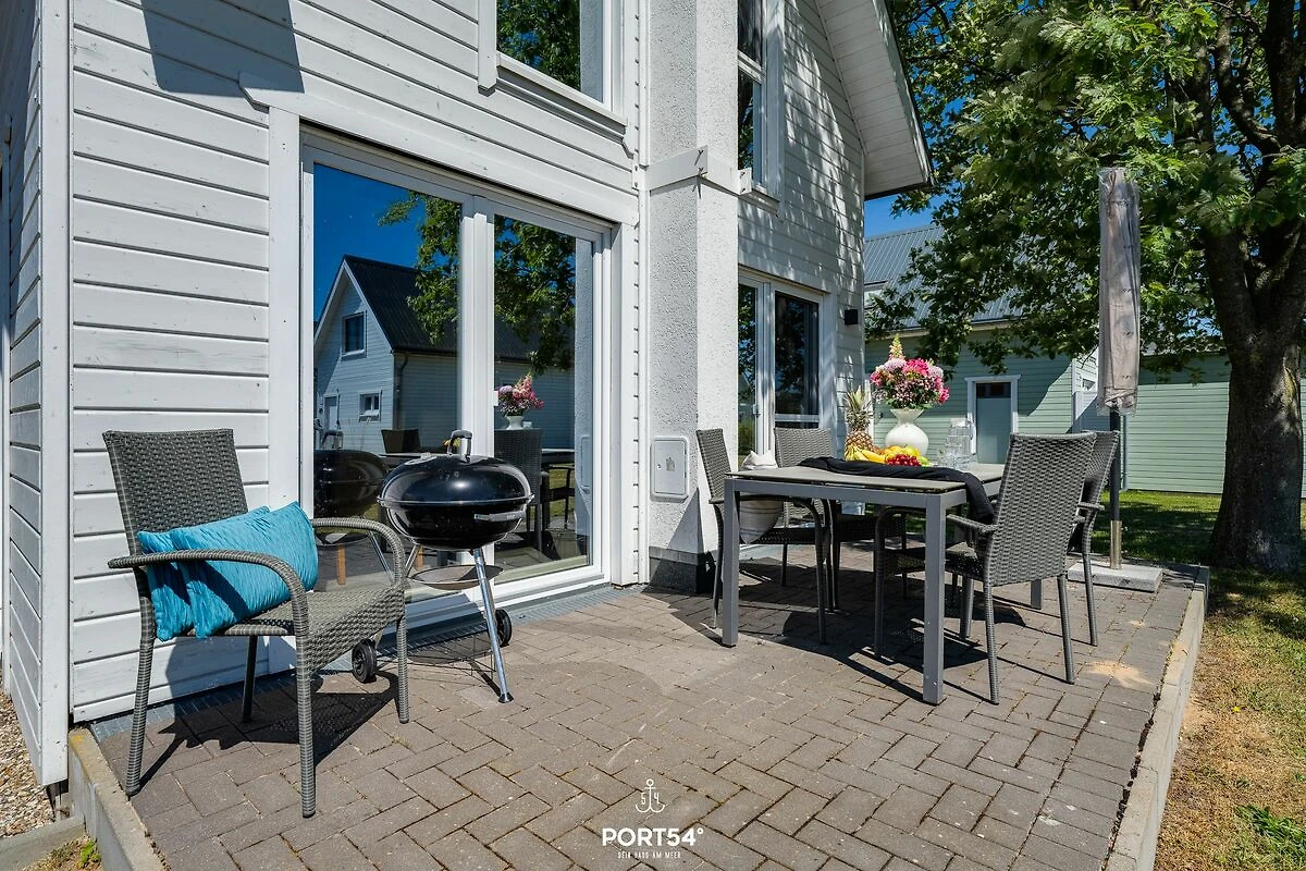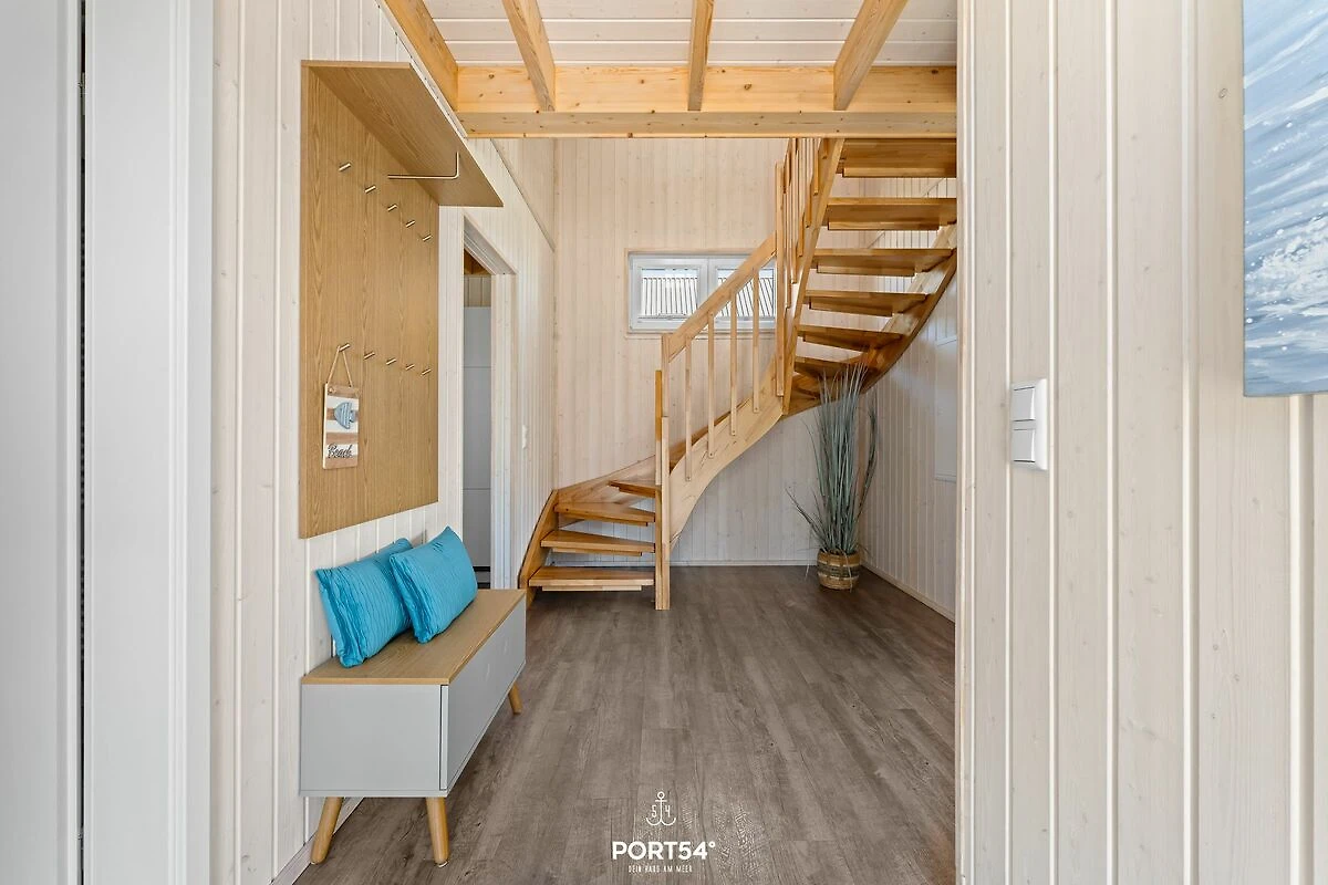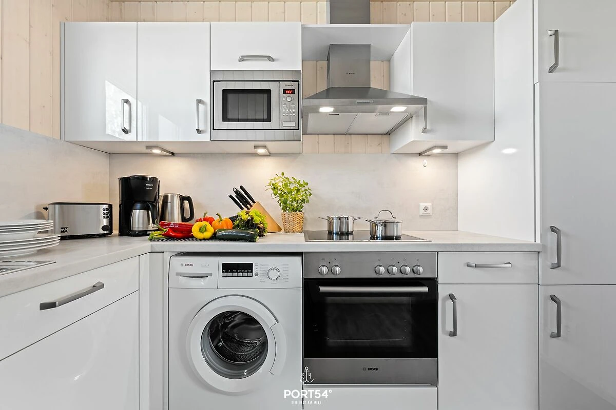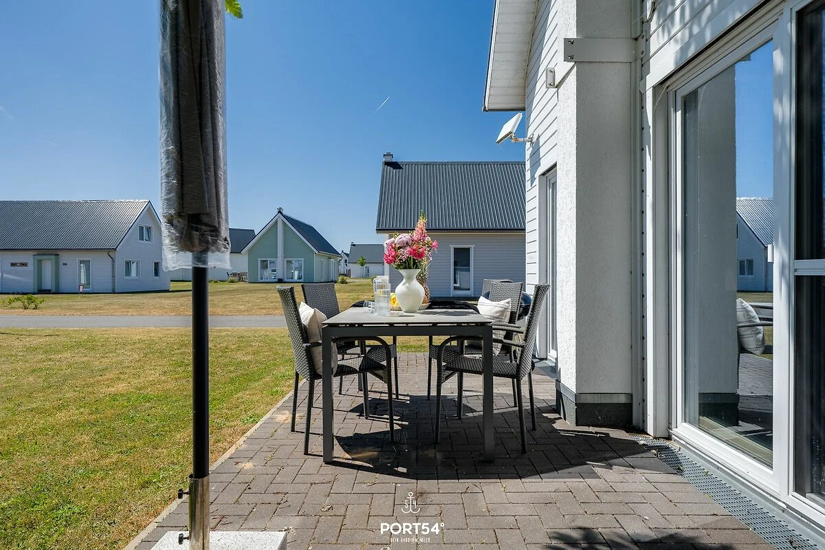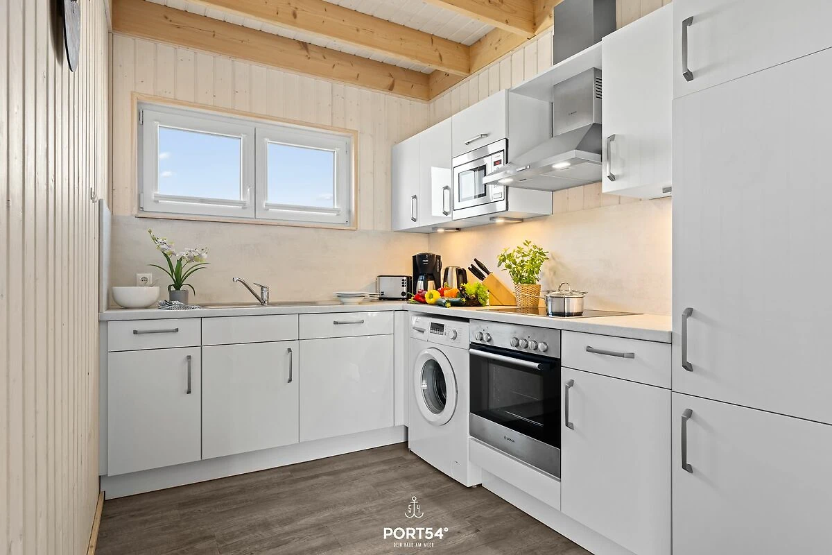 Herzlich Willkommen im "Wellenreiter" im OstseeResort Olpenitz. Einziehen und sich wie zu Hause fühlen – besser kann ein Urlaub nicht beginnen. Ihr freistehendes Ferienhaus besticht durch seine Lage, umgeben von einer grünen Wiese in unmittelbarer Nähe zur Ostsee. Bereits bei Eintritt verspüren Sie die Gemütlichkeit Ihres Ferienhauses. Hier besticht nicht nur die hochwertige Einrichtung, sondern auch als weiteres Highlight - ein Kamin im Wohnzimmer, der eine wohlige Wärme ausstrahlt. An kalten Tagen können Sie es sich dort nach langen Strand-Spaziergängen gemütlich machen. Liebevoll ausgesuchte Dekoration rundet die gemütliche Atmosphäre ab. Bei Sonnenschein sorgen die großen Panorama-Fenster für ein lichtdurchflutetes Wohlfühl-Ambiente. Im Wohnzimmer steht Ihnen ein Schlafsofa zur Verfügung, auf der noch eine weitere Person Platz findet. Weiterhin befindet sich im Erdgeschoss ein modernes Wellness-Bad mit einer Infrarotkabine, Dusche und WC. Die modern eingerichtete Küche lässt keine Wünsche offen. Sie finden hier alles, um sich und Ihre Mitreisenden kulinarisch verwöhnen zu können. Vom Wohnzimmer aus betreten Sie die 12m² große Terrasse, die zum Entspannen einlädt. Die Terrasse bietet neben Gartenmöbeln einen Sonnenschirm, sowie einen Holzkohlegrill. Gemütlichem Grillen an lauen Sommerabenden steht also nichts im Wege. Im Obergeschoss befinden sich zwei großzügige Schlafzimmer mit Boxspringbetten. Ein Schlafzimmer verfügt über ein Boxspringbett (200x200cm), im zweiten Schlafzimmer befinden sich zwei Einzel-Boxspringbetten (je 100x200cm). Ein zweites Bad, ausgestattet mit Badewanne, WC und Föhn rundet das Obergeschoss ab. Für Ihren PKW steht vor dem Haus ein Stellplatz zur Verfügung. Das Haus wird für 4 Erwachsene und 1 Kind angeboten.