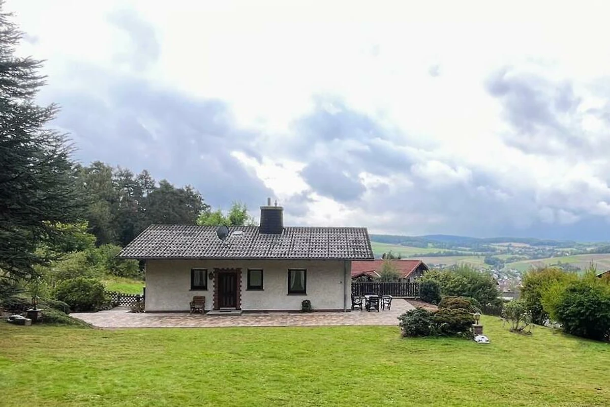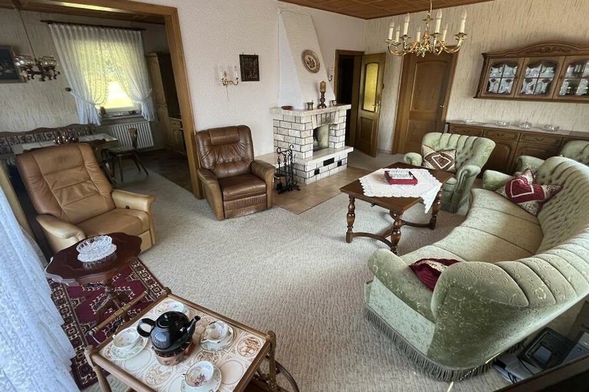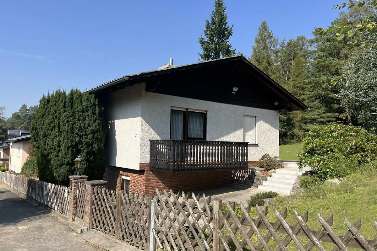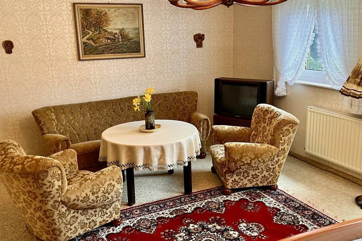 Dieses schöne Häuschen steht am Rande eines ehemaligen, kleinen Feriengebietes auf einer Anhöhe, welches an 3 Seiten von Wald umsäumt ist. Das Grundstück mit knapp 1.500 Quadratmeter liegt zu 2 Seiten direkt am Wald und verfügt über einen Ausblick über das gesamte Tal und die umliegende Umgebung. Hier lebt man Natur pur. Das Haus wurde seit Erbauung nur wenige Tage im Jahr als privates Ferienhaus gehobener Klasse genutzt. Die Einrichtung befindet sich daher in einem sehr gutem Zustand "Original-Zustand" und wird als "Vintage" vermietet. Tauchen Sie ein in die Zeit der 80er-Jahre, fast jeder findet hier "Relikte" seiner Kindheit. Federkern-Sofa, Röhrenfernseher, Wandteppiche, Allibert und Goldrandgeschirr lassen unsere Gäste eine Reise in die Vergangenheit machen. Unser Ferienhaus ist "rundum" ausgestattet. Folgende "Dinge des Alltags" sind vorhanden: Küche: Backofen, Herd, Kühl- und Gefrierschrank, Spülmaschine, Mikrowelle, Toaster, Wasserkocher, Kaffeemaschine, Waffeleisen. Badezimmer: Dusche (80x80cm), Doppelwaschbecken, WC, Föhn. Kleines WC: Waschbecken, WC. Wohnzimmer: Polstergarnitur, Flachbild-Smart-TV, 2 Leder-Relaxsessel. Schlafzimmer 1: Doppelbett 200x200cm. Schlafzimmer 2: Doppelbett 200x180cm (TV). Schlafzimmer 3: ein Einzelbett. Schlafzimmer 4: zwei Einzelbetten. Die grundstückseigene Gartensauna kann gegen Gebühr genutzt werden. Handtücher und Bettwäsche sind im Preis enthalten. Ihr Haustier können Sie gegen eine Gebühr dazu buchen.