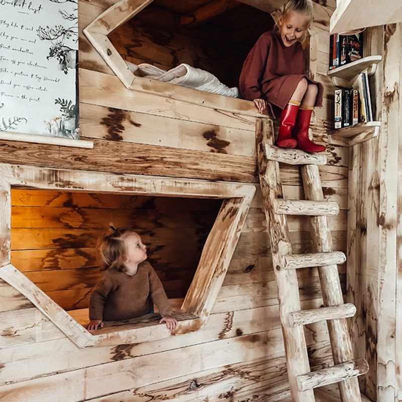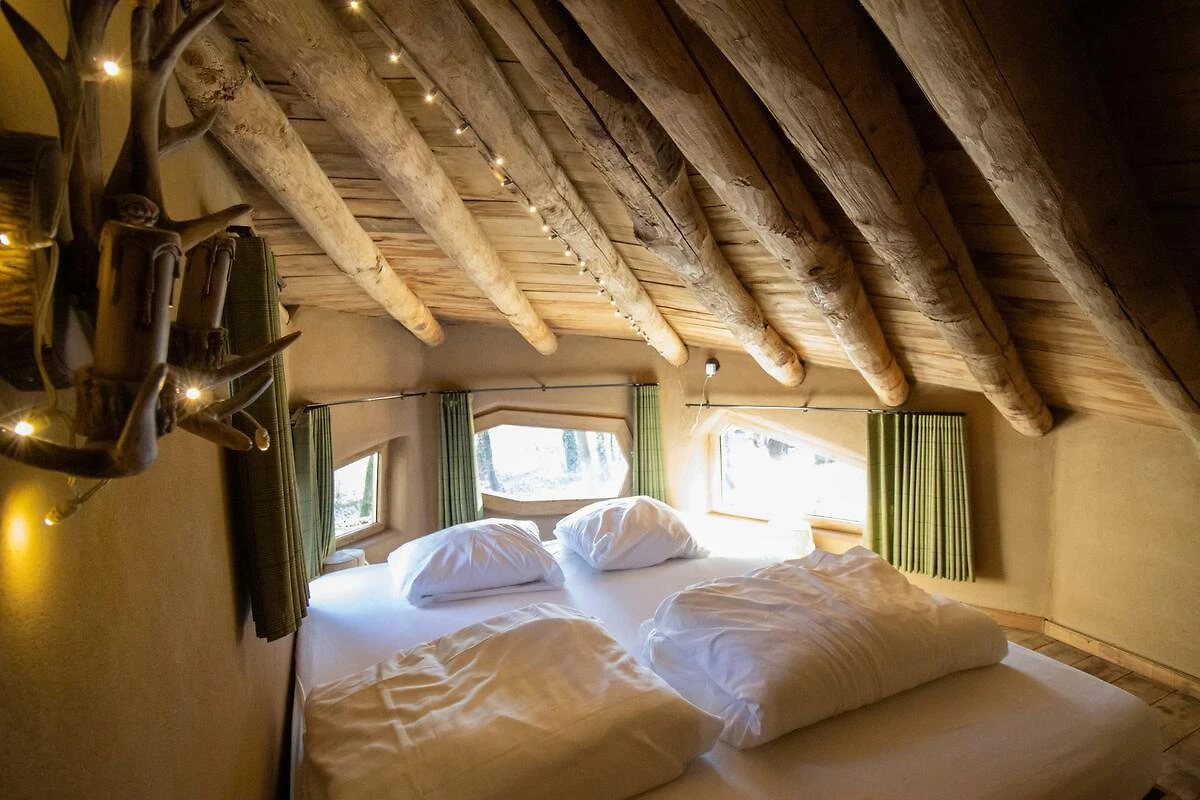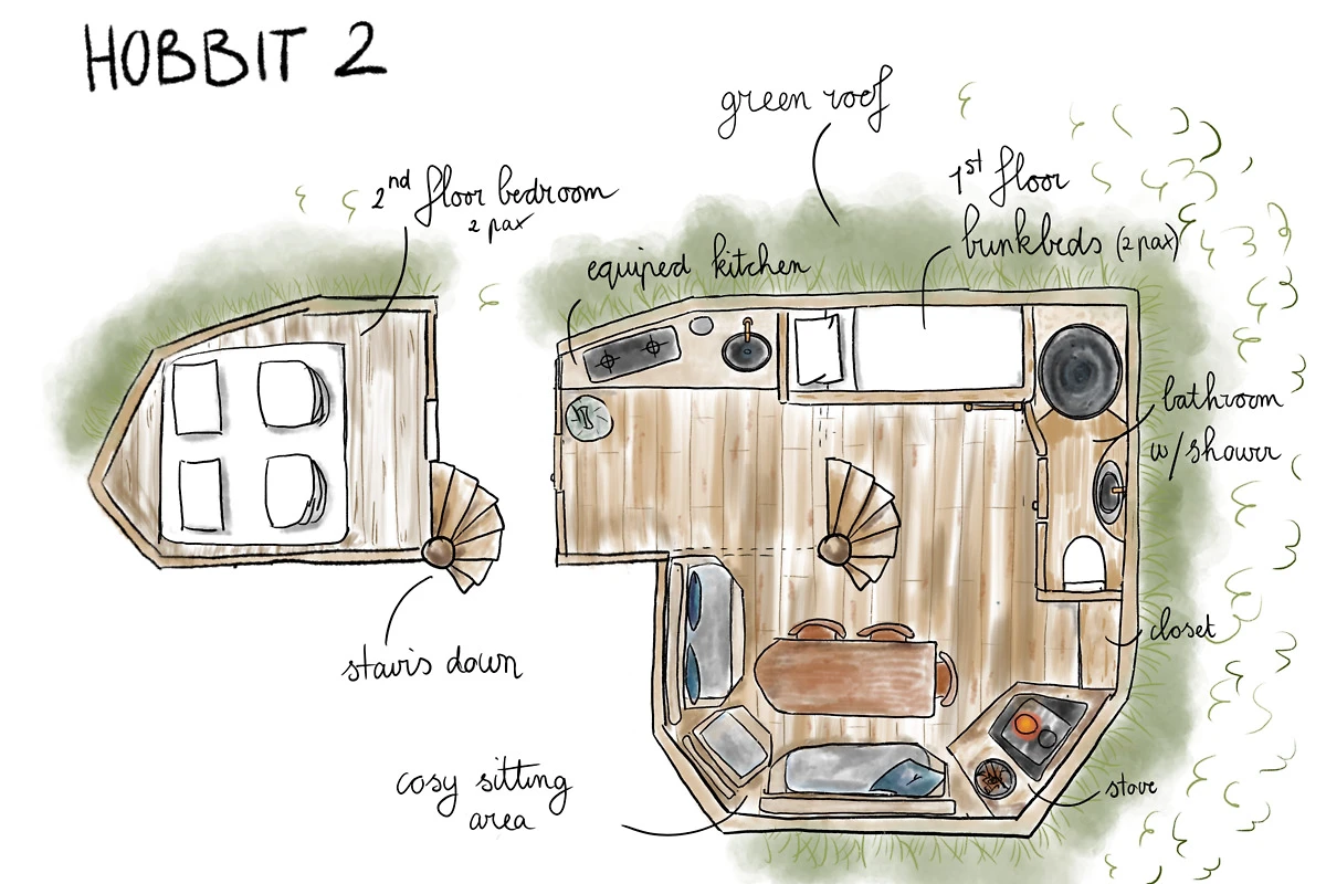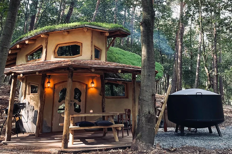 ? In unserem brandneuen, im Wald gelegenen Hobbit-Haus werden Märchen zum Leben erweckt. Diese Hütte bietet Platz für 4 Personen und verfügt über einen märchenhaften Whirlpool, ganz im Stil des gleichnamigen Films.Geniessen Sie die einzigartige Umgebung, ohne auf grundlegenden Komfort verzichten zu müssen, denn wie die anderen Hütten verfügt auch dieses einzigartige Naturhäuschen über eine gemütliche Küchenzeile, einen Holzofen und ein gemütliches Badezimmer. Was kann man sich mehr wünschen?Jeder Winkel des Hobbit-Hauses strahlt den Geist von Abenteuer und Wunder aus. Es ist ein Ort, an dem die Fantasie lebendig wird und an dem man in die verzauberte Welt der Märchen eintauchen kann.? Cosy livingAuf dem Weg zu diesem Hobbit-Cottage wähnt man sich unweigerlich in einer Märchenwelt. Die Terrasse empfängt Sie als erstes, ein guter Start für einen entspannten Urlaub!Treten Sie durch die Holztür mit märchenhaften Details und lassen Sie sich von der Wärme und Gemütlichkeit überraschen, die das Innere dieser zauberhaften Wohnung zu bieten hat.Der Wohnbereich mit Standard-Küchenzeile ist der ideale Ort, um gemeinsam zu entspannen, ein gutes Buch zu lesen, ein Brettspiel zu spielen oder einfach nur im Hier und Jetzt zu sein. Sie können diesen Raum mit einem Holzofen beheizen. Es gibt ein Starterpaket für den Holzofen, zusätzliches Holz können Sie selbst an der Holzecke schneiden. Bei schönem Wetter können Sie die Tür öffnen und die überdachte Terrasse mit Whirlpool betreten. Abends können Sie sich im warmen Schein Ihrer Öllampe und bei geschlossenen Vorhängen für den schönen Tag bedanken.Die Küchenzeile ist mit einem Gasherd (2 Brenner), einer Spüle und ausreichend Kochutensilien, Besteck und Gläsern ausgestattet. Sie können nicht auf Ihre tägliche Kaffeepause verzichten? Dann wird Ihnen unsere Bialetti sicher helfen. Vergessen Sie nicht, Ihren gemahlenen Kaffee mitzubringen. Das Leitungswasser ist trinkbar.Geschirrspülmittel und ein Reinigungsset inklusive Küchentuch sind vorhanden. Ein kleiner Kühlschrank ist in der Kochnische vorhanden.? Sweet dreamsDie Kinder werden in ihrem eingebauten Bett in der Nähe des Wohnbereichs sicher süsse Träume haben. Über die Holztreppe im Dachfirst erreichen Sie einen Schlafbereich für 2 Personen. Die Bettwäsche ist standardmässig vorhanden.? Wash worries away