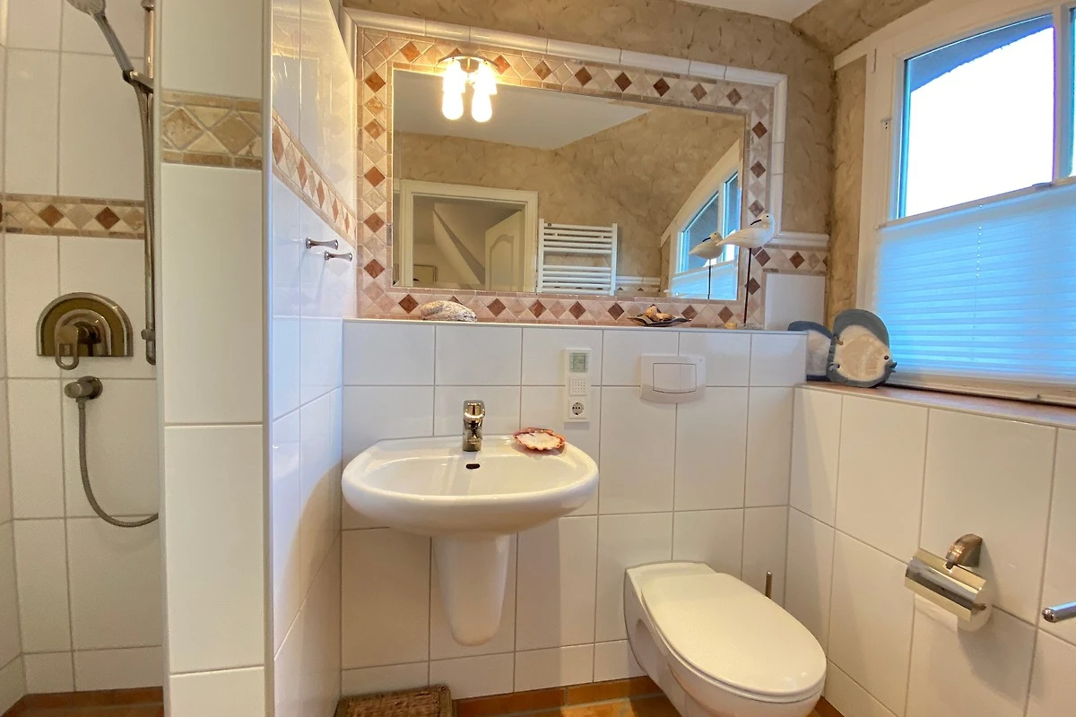 Elegantes Badezimmer mit Dusche und WC , in dem Sie sich nach einem langen Tag entspannen können.