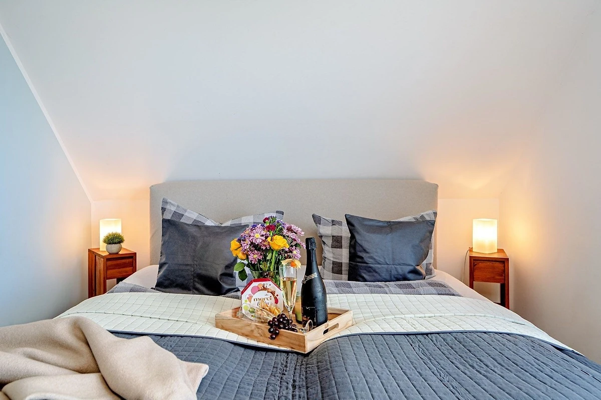 Im ersten Obergeschoss erwartet Sie ein stilvoller Ruhebereich mit atemberaubendem Blick über das weite Meer. Das Hauptschlafzimmer mit Smart TV und einem komfortablen Boxspringbett und das zweite Schlafzimmer mit zwei Einzelbetten bieten erholsamen Schlaf. Ein Babybett steht ebenfalls bereit.
