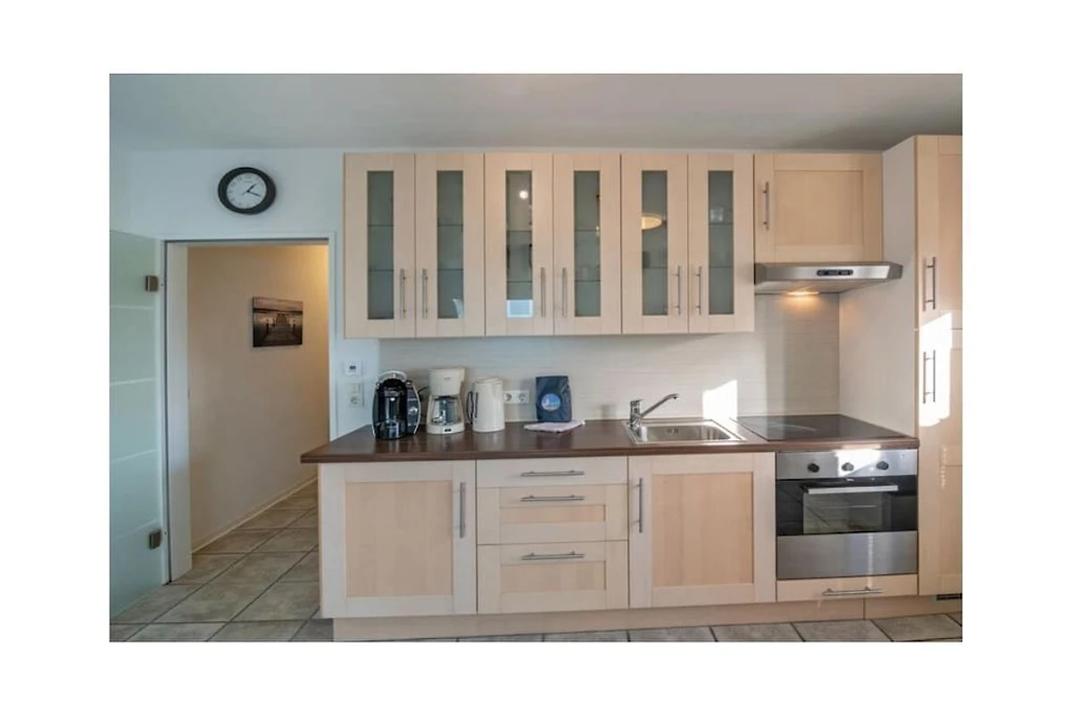 Herzstück des Apartments bildet der Wohn- Essbereich mit integrierter Küche. Hier können Sie auf der bequemen Wohnlandschaft herrlich entspannen und lange Fernseh- oder gemütliche Leseabende verbringen. Für die mediale Unterhaltung stehen Ihnen ein moderner Flachbildfernseher mit Satellitenempfang, Digitalfernsehen, ein BLueray- und DVD-Player, eine Stereoanlage sowie Internetradio zur Verfügung. Zudem finden Sie hier eine Auswahl an DVDs, Büchern und Spielen vor, so dass Ihnen auch an regnerischen Nachmittagen nicht langweilig wird.