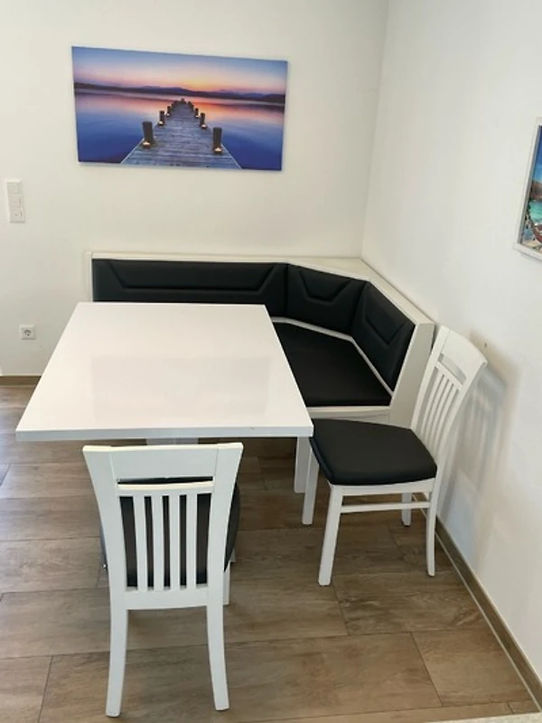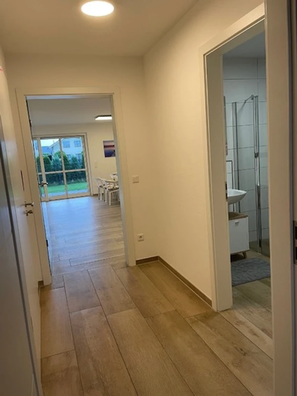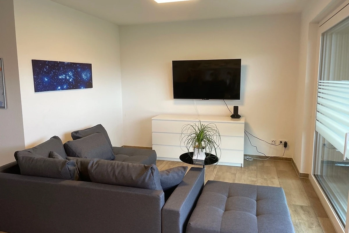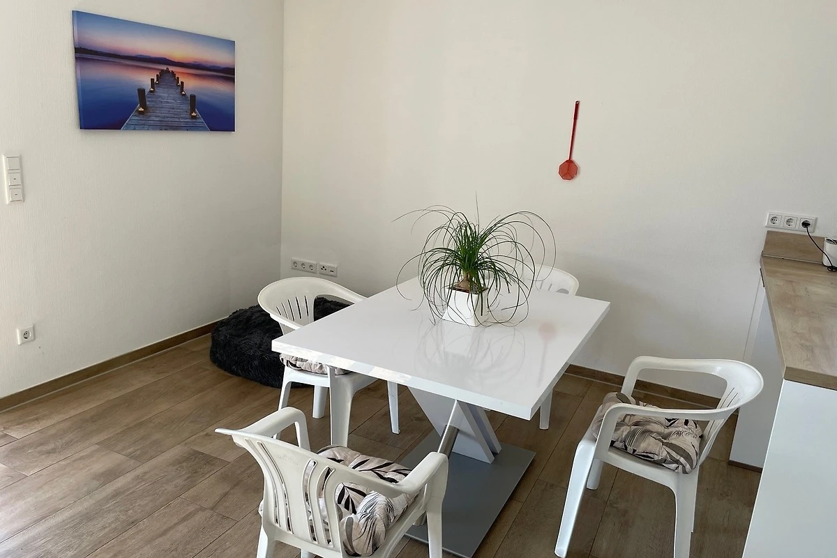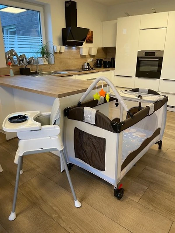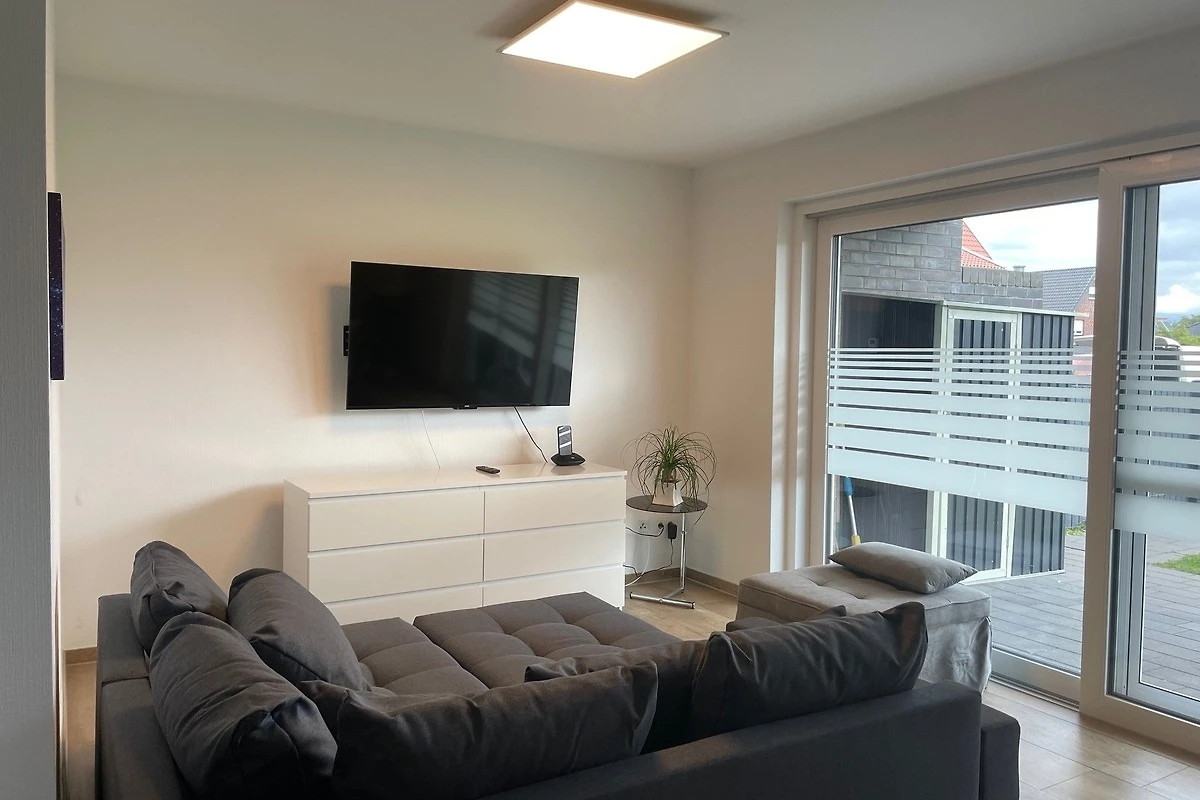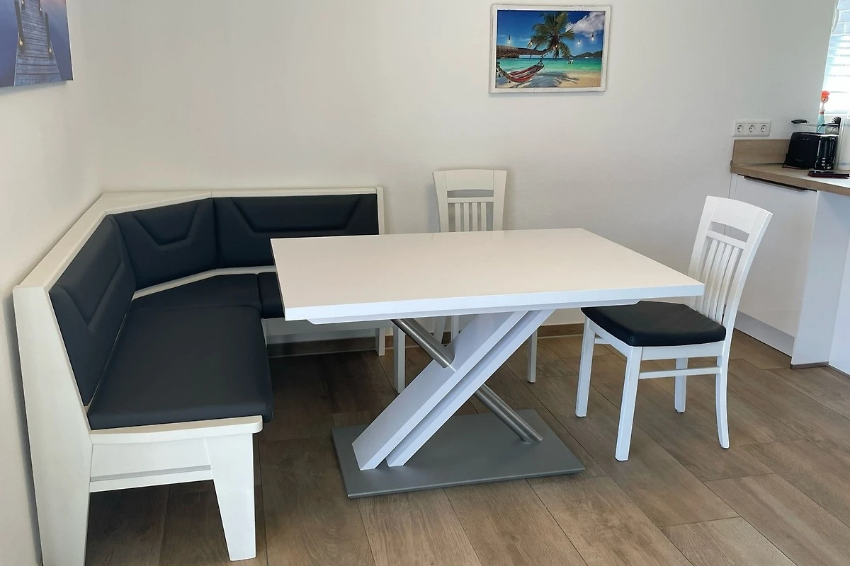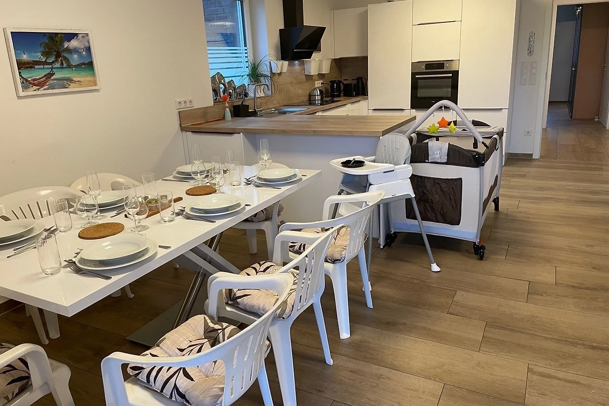 Wohnungsgrösse: circa 70qm, 1 Schlafzimmer mit Doppelbett und geräumigem Kleiderschrank und Stellfläche für Ein-Personen-Zustellbett, Wohn-Esszimmer-Küche mit Einbauküche einer Eckbank mit 2 dazu passenden Stühlen und einem Ausziehtisch und in der Küche die wichtigsten Koch-Utensilien, Geschirr, Gläser und Besteck. WLAN & TV-Gerät. Couch-Schlaflandschaft für 2-3 Personen, Bad/WC/Dusche ebenerdig & barrierefrei