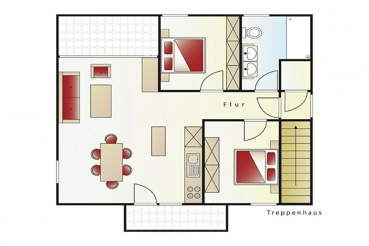 Auf 40 m² erstreckt sich der Mittelpunkt der Wohnung – der gemütliche Wohn-Essbereich mit offener Küche und einem großen Flachbild-TV. Genießen Sie die Sonne auf unserer zusätzlich ca. 10 m²großen Dachterrasse. Die 2 Schlafzimmer (180 cm Doppelbetten mit Komfortmatratzen) sind rustikal eingerichtet und verfügen jeweils über einen Flachbild-TV. Das großzügige Badezimmer besteht aus Sportdusche (Rainedance) Doppelwaschbecken, Kosmetikspiegel, Föhn und natürlich einer Fußbodenheizung.