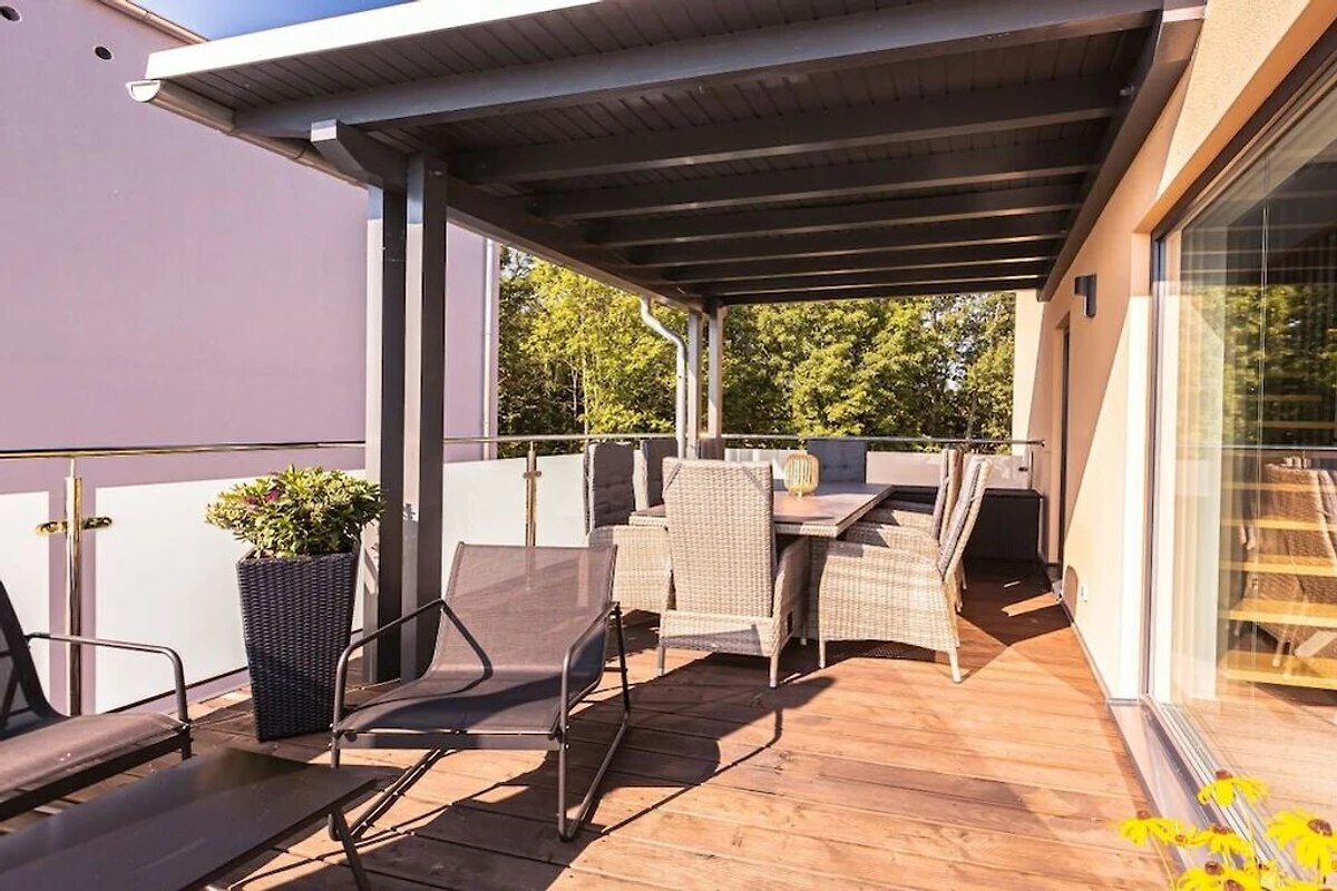 teils überdachte Terrasse mit großem Esstisch und zusätzlichen Loungemöbeln