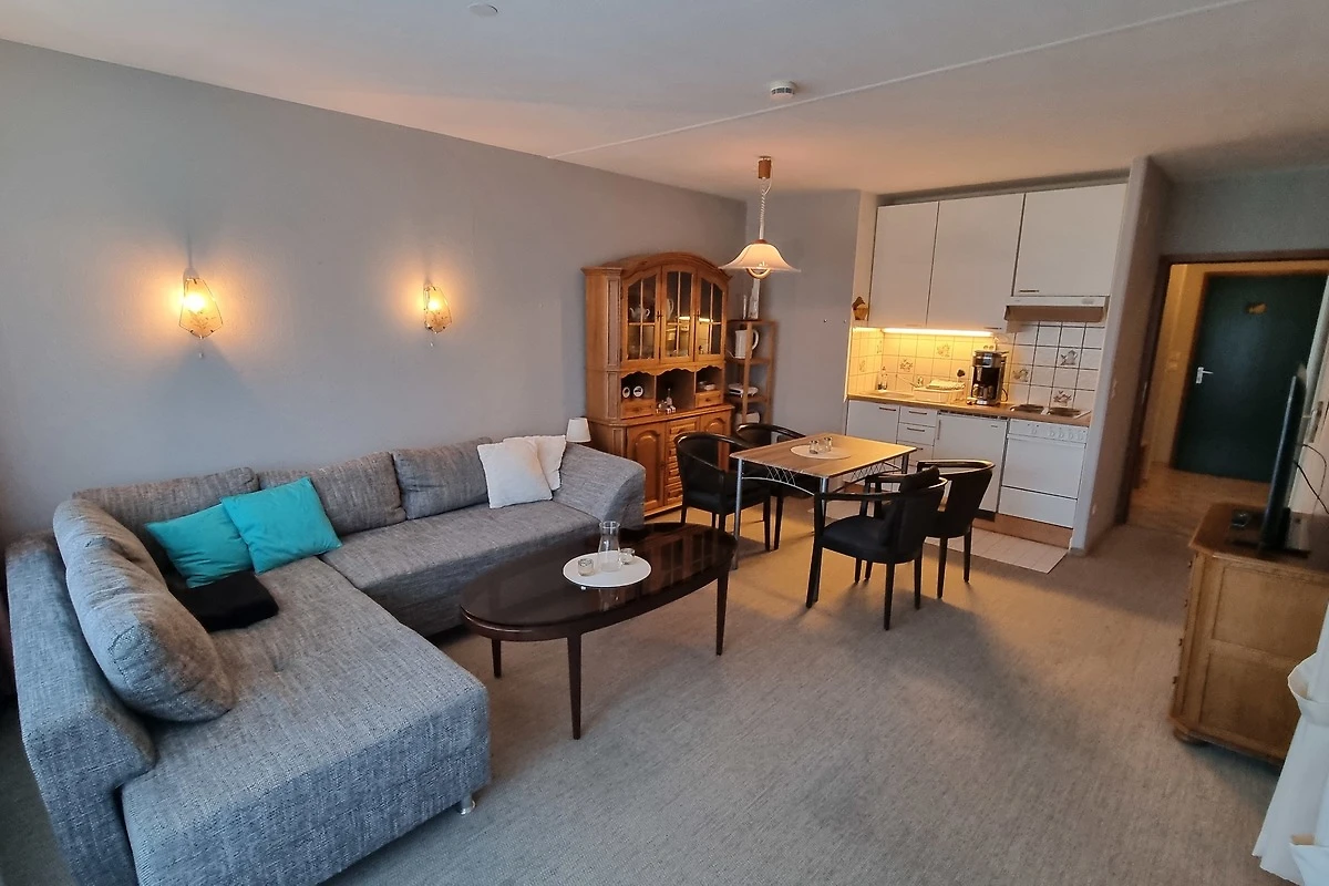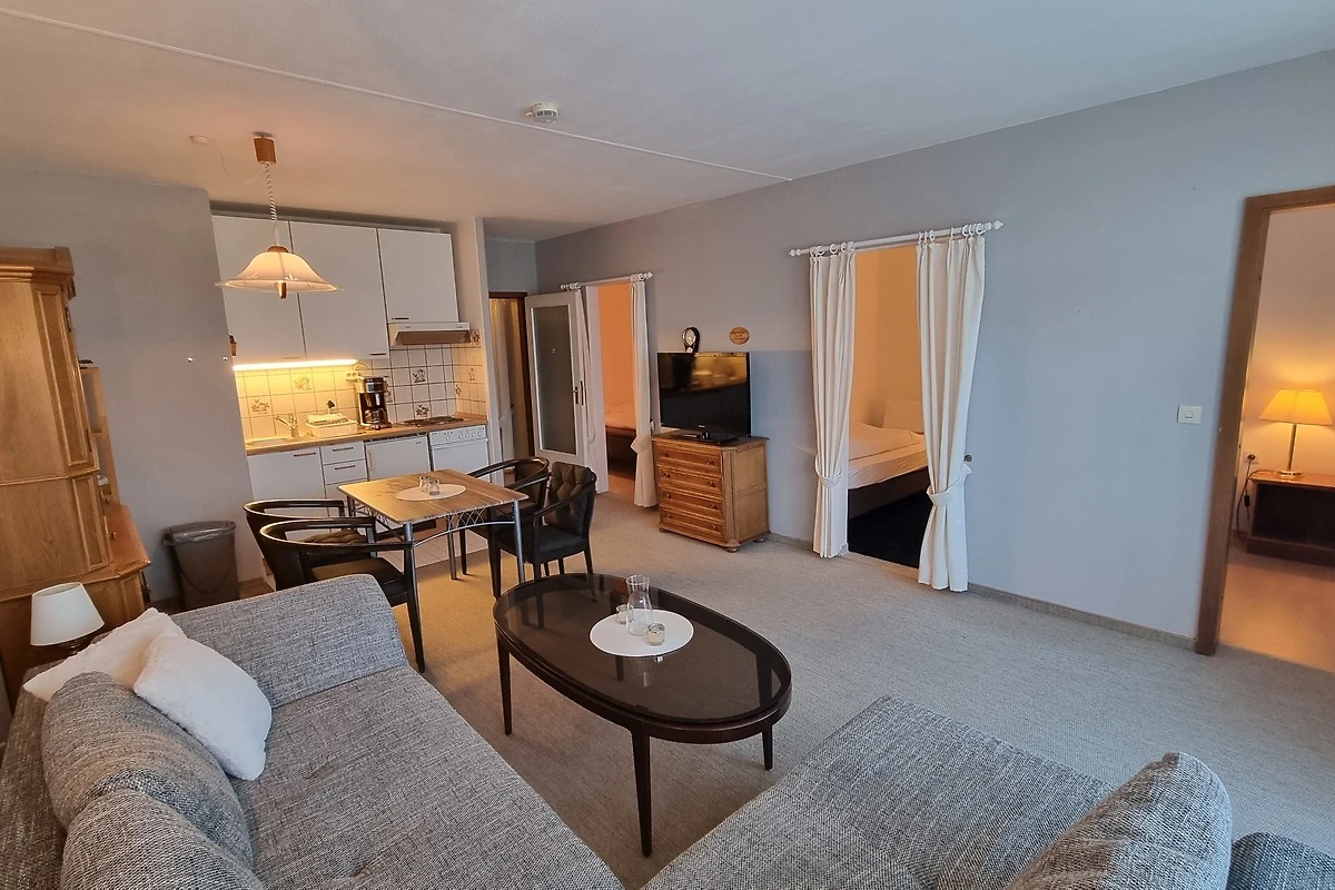 Die Wohnung ist voll ausgestattet und bietet Ihnen alles, was Sie für einen angenehmen Aufenthalt benötigen. Der offene Wohnbereich lädt mit gemütlichen Sitzgelegenheiten zum Verweilen ein, und die Küche ist komplett eingerichtet, sodass Sie Ihre Mahlzeiten auch selbst zubereiten und im Essbereich geniessen können. Selbstverständlich steht Ihnen kostenfreies WLAN zur Verfügung. Der grosszügige Balkon samt Sitzmöglichkeiten steht Ihnen ebenso zur Verfügung. Für Ihre Skiausrüstung, Ihre Fahrräder oder ein Hundebett befindet sich ein grosser Abstellraum in der Ferienwohnung.