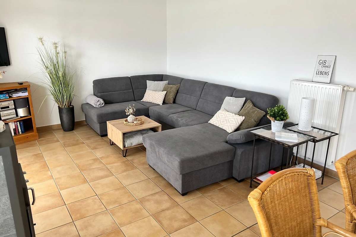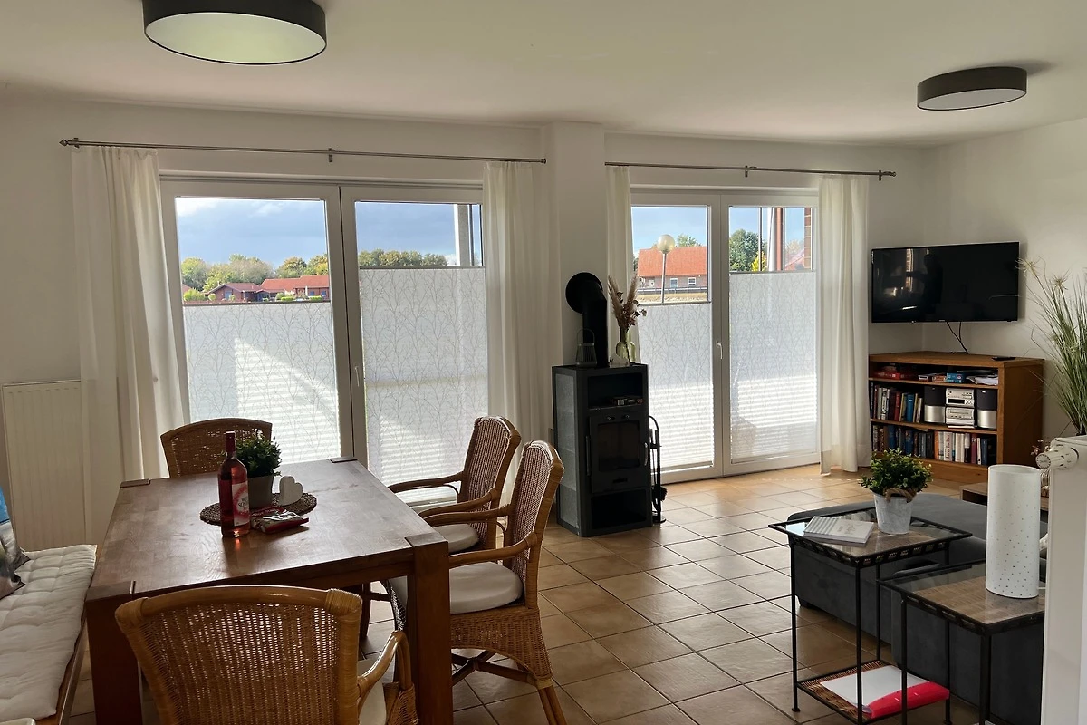 - grosses Wohn- Esszimmer mit offener Küche, Kaminofen und Ausgang auf die Terrasse
