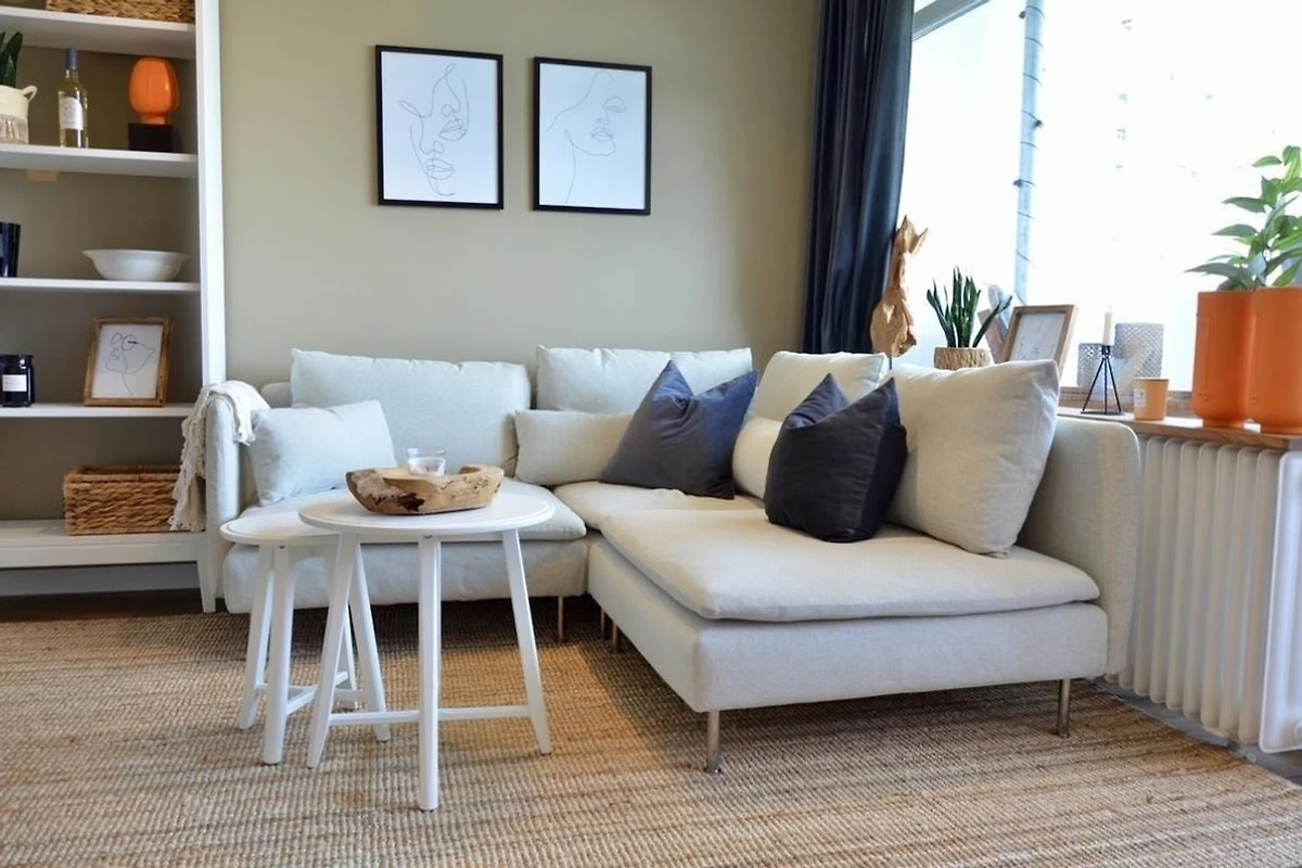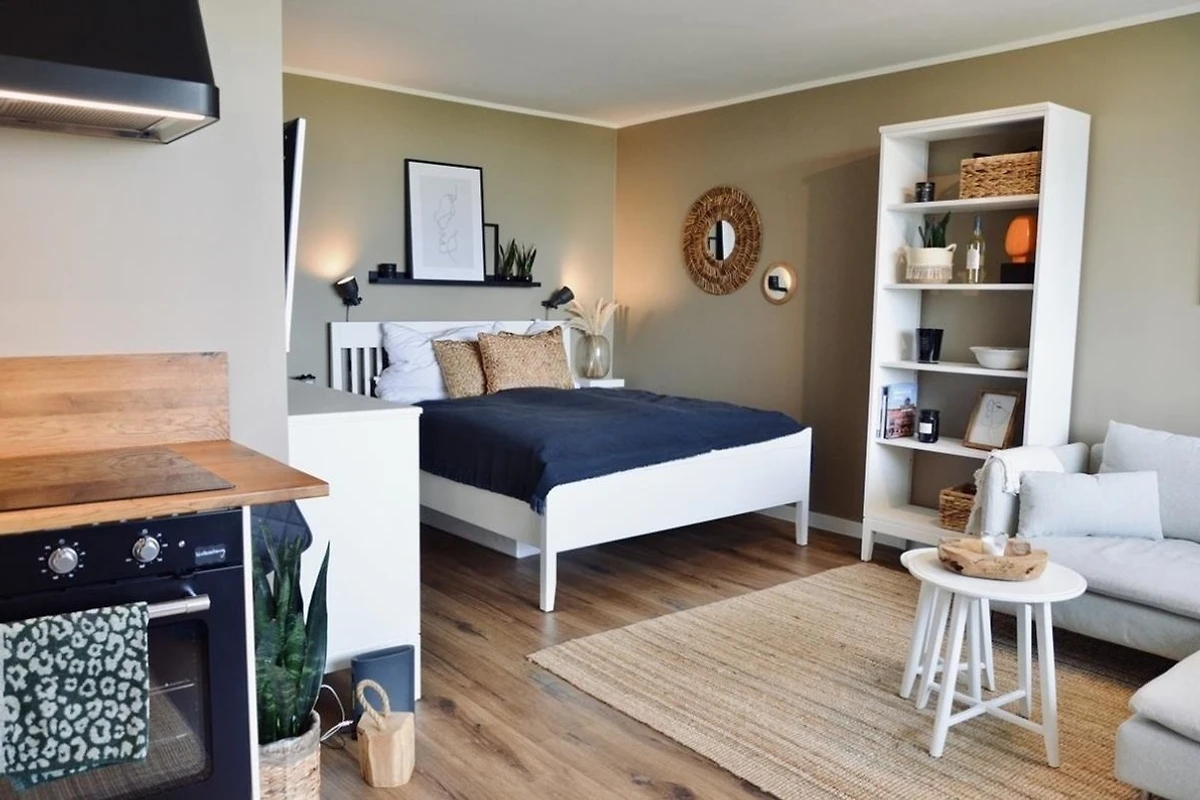 Die Wohnung ist unterteilt in den hellen und lichtdurchfluteten Wohnbereich mit einem gemütlichen Ecksofa, einem Doppelbett (ca. 180x 200 cm) im hinteren Bereich, einer modernen Küchenzeile, sowie einer Essecke für zwei Personen. Im Eingangsbereich finden Sie eine geräumige Garderobe, sowie den Zugang zum Duschbad.