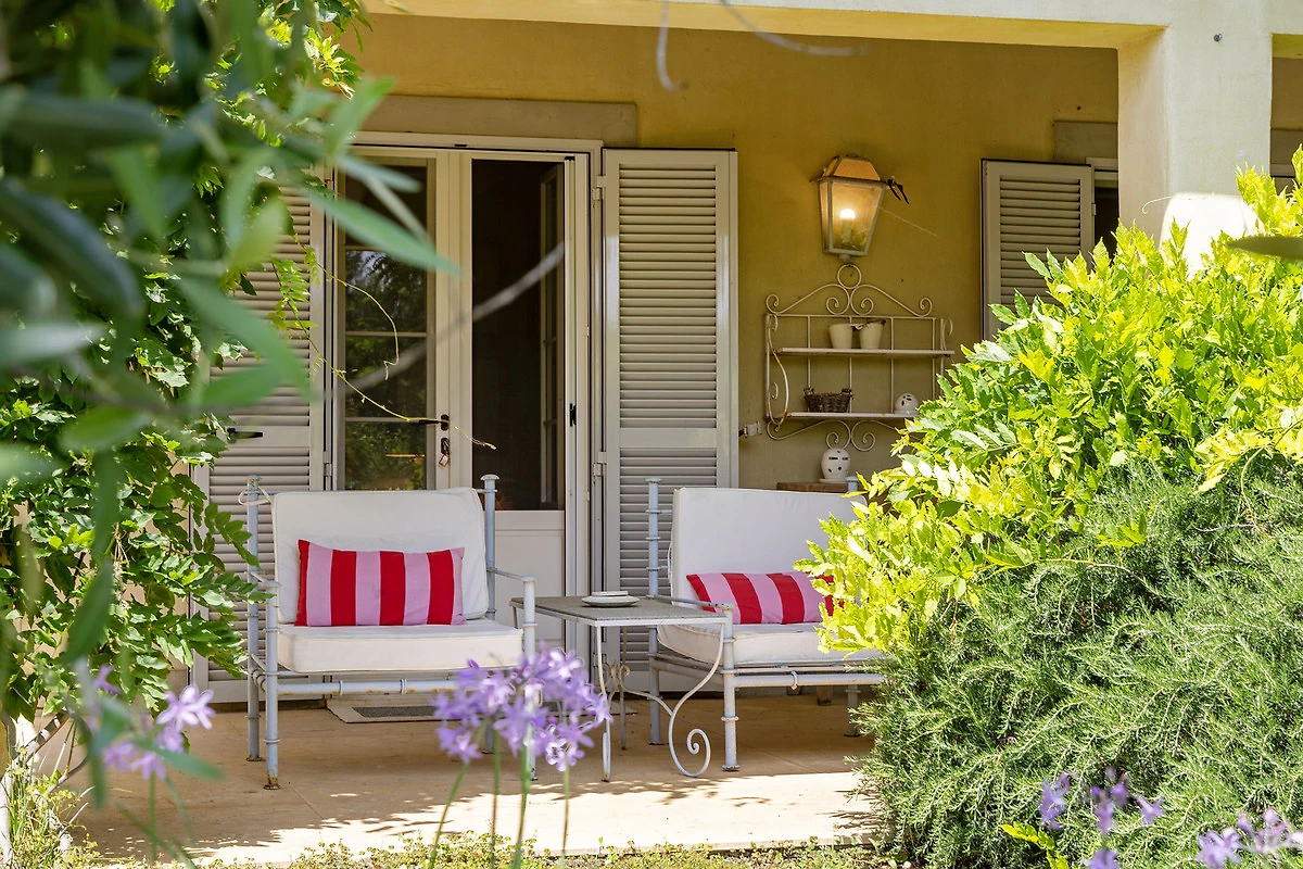 Im Haupthaus bietet eine Pergola mit Sofas zusätzlichen Platz zum Entspannen, während eine Pergola mit direktem Zugang zur Küche ebenfalls mit Sofas und Esstisch ausgestattet ist, ideal für gemütliche Mahlzeiten im Freien.