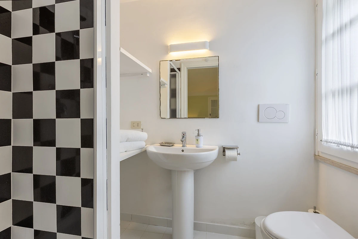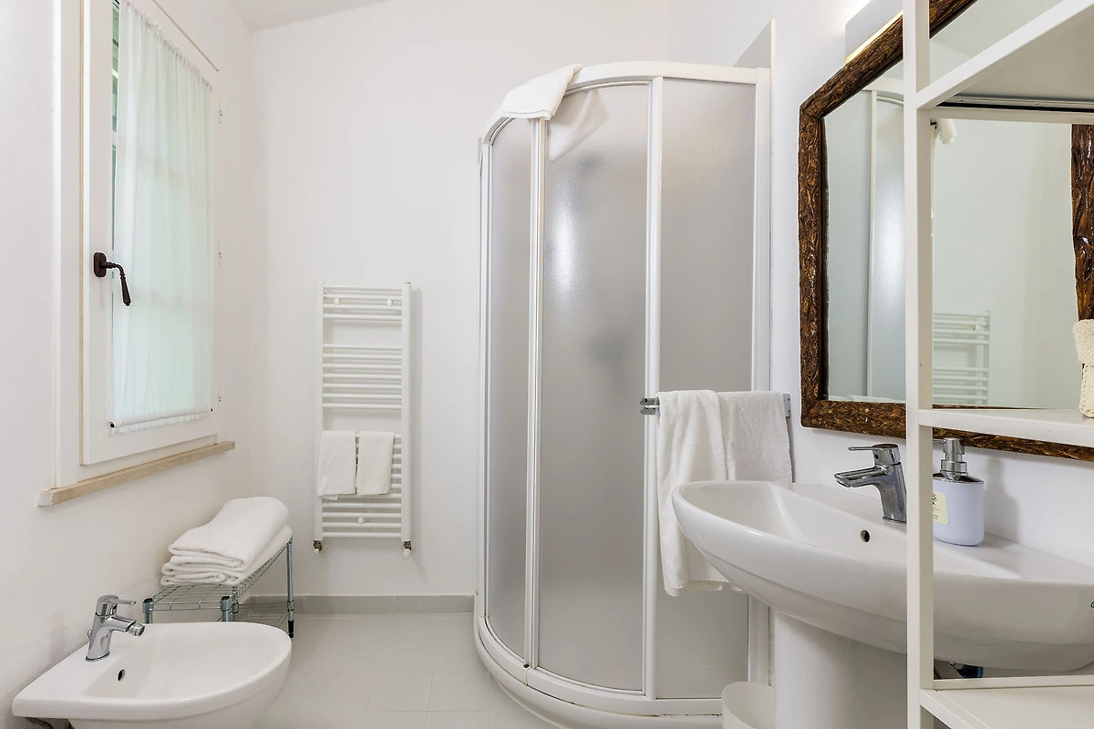 Im ersten Stock befindet sich ein Doppelzimmer mit Terrasse und ein eigenes Badezimmer mit Dusche.
