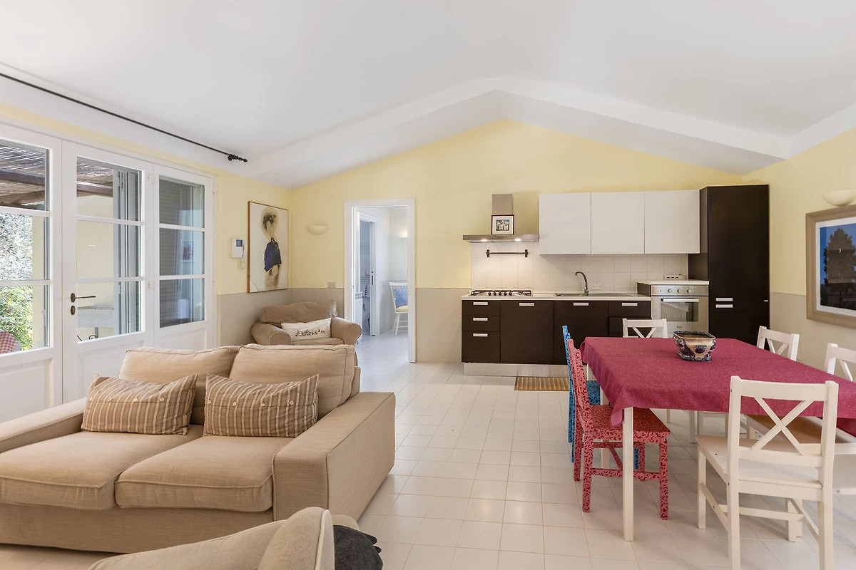 - einem Wohnzimmer mit Sofas, Fernseher mit Satellitenempfang und Sky-Decoder, Esstisch und Küche ausgestattet mit Herd und Kühlschrank mit Gefrierfach, mit Zugang zur Pergola, die mit Sofas und Esstisch ausgestattet ist;