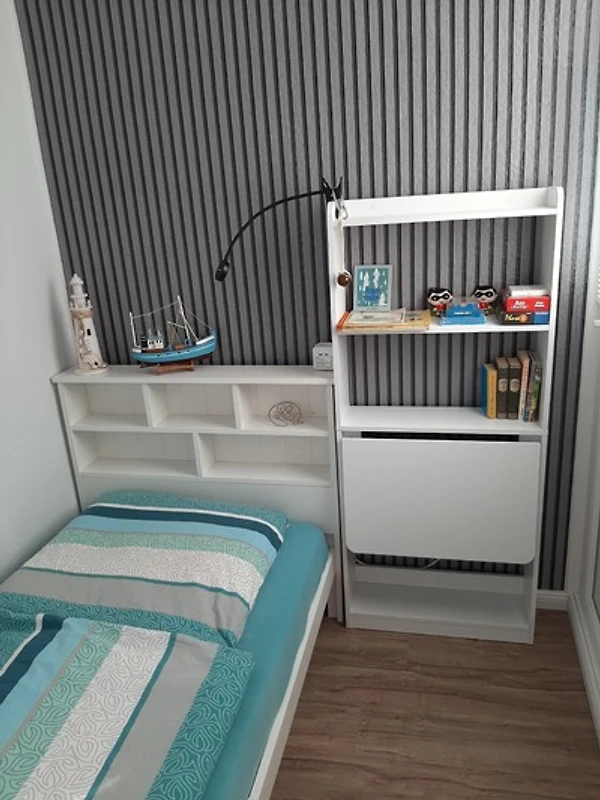 1 sep. Zimmer: Zimmer abgehend vom Wohnzimmer verfügt über ein Fenster, 1 Bett 90x200 cm, Regal mit Schreibfläche, Spielsammlung. Verdunklungsmöglichkeit