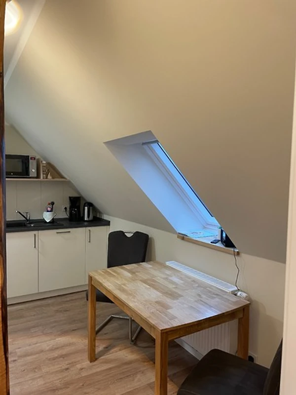 Die Küche ist komplett ausgestattet und bietet alles, was Sie für die Zubereitung köstlicher Mahlzeiten benötigen. Ein Esstisch für zwei Personen lädt zu gemütlichen Mahlzeiten ein.
