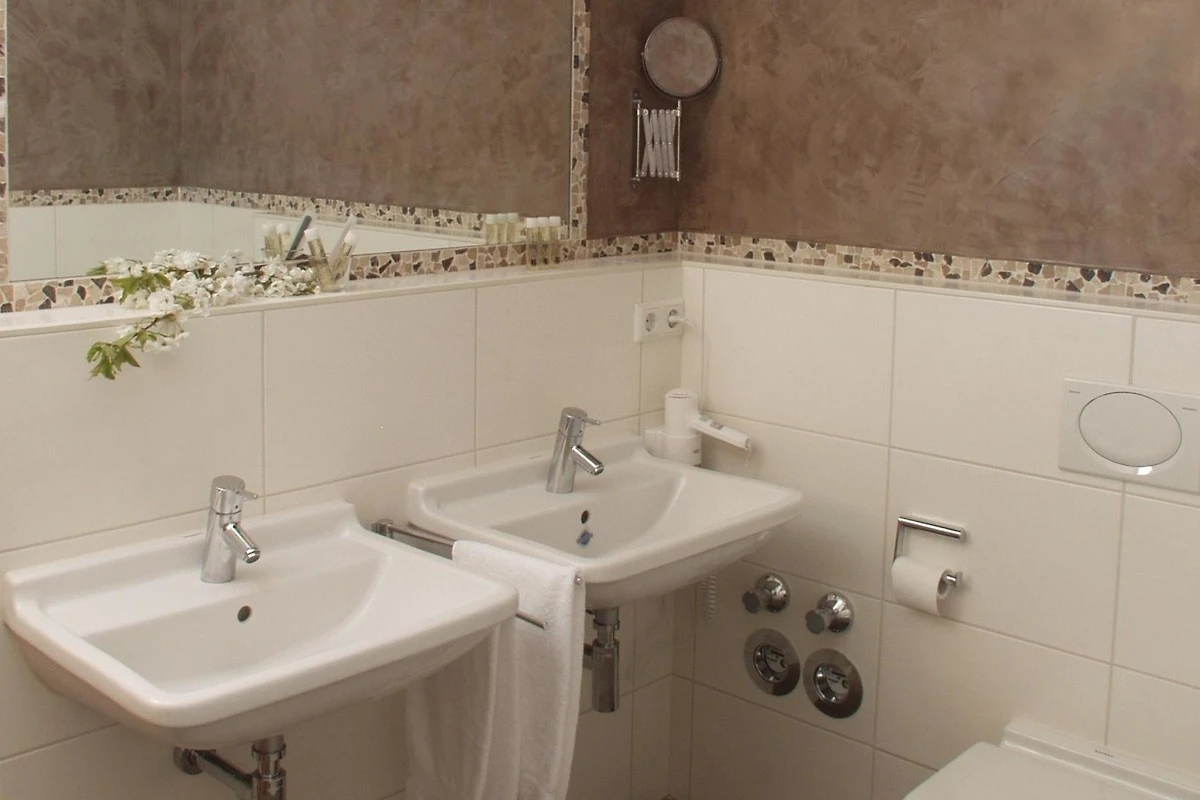 Badezimmer mit Badewanne, 2 Waschbecken, Dusche, 2 WC, Handtuchwärmer, Föhn und Kosmetikspiegel