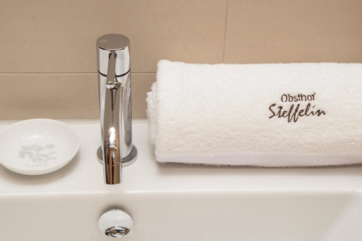 • Badezimmer mit Waschbecken, Dusche, WC, Handtuchwärmer, Föhn und Kosmetikspiegel