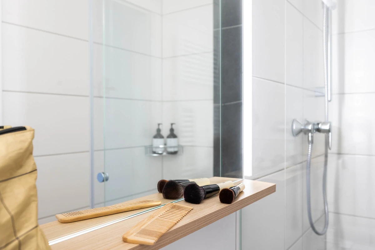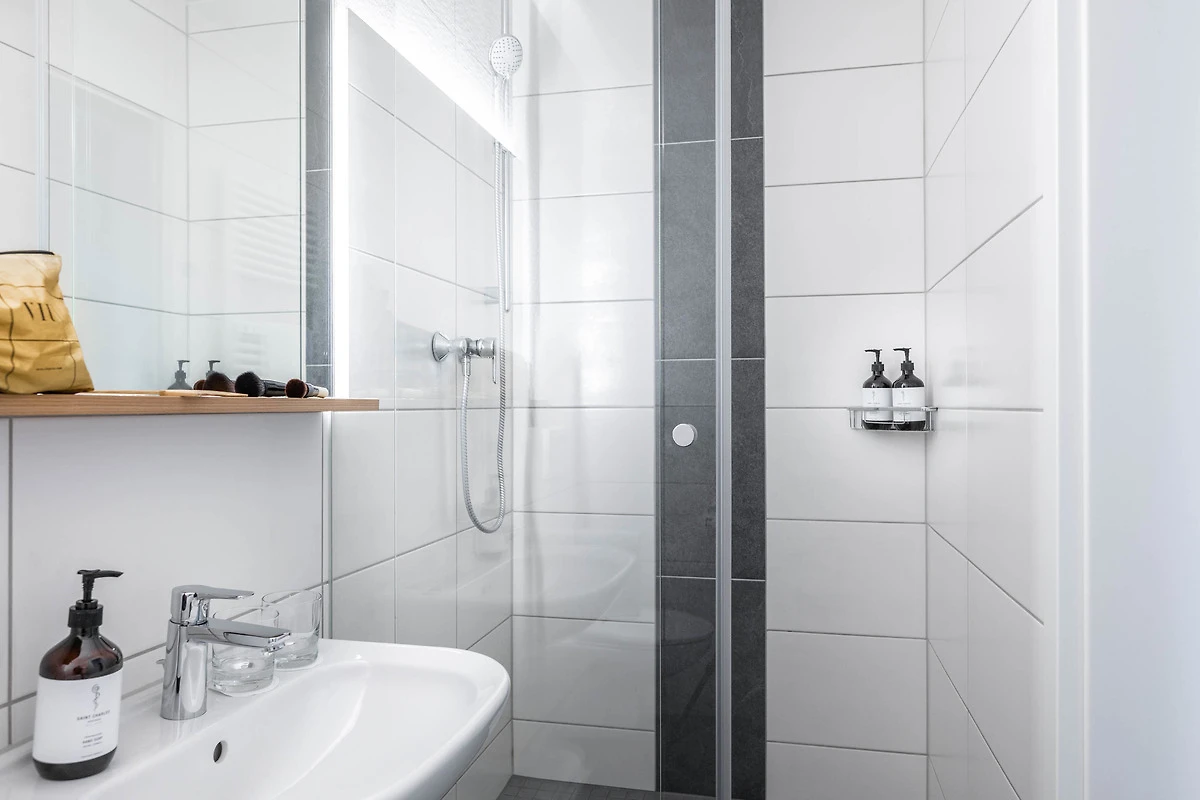 Das Schlafzimmer ist komfortabel gestaltet und bietet ein hochwertiges Bett für erholsame Nächte. Ein Kleiderschrank sorgt dafür, dass Ihre persönlichen Dinge ordentlich verstaut werden können. Im modernen Badezimmer finden Sie eine Dusche und kostenlose Pflegeprodukte, die Ihren Aufenthalt noch angenehmer machen.