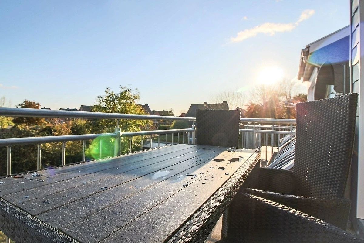Im Aussenbereich befindet sich der sonnige Balkon mit Gartenmöbeln.