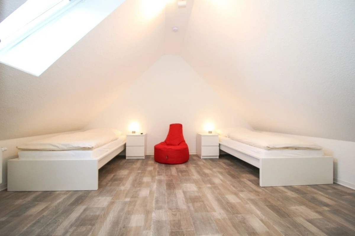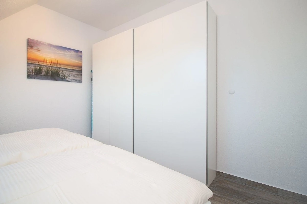 Über die Treppe im Eingangsbereich erreichen Sie das Obergeschoss der Wohnung. Hier stehen Ihnen zwei Einzelbetten zur Verfügung.