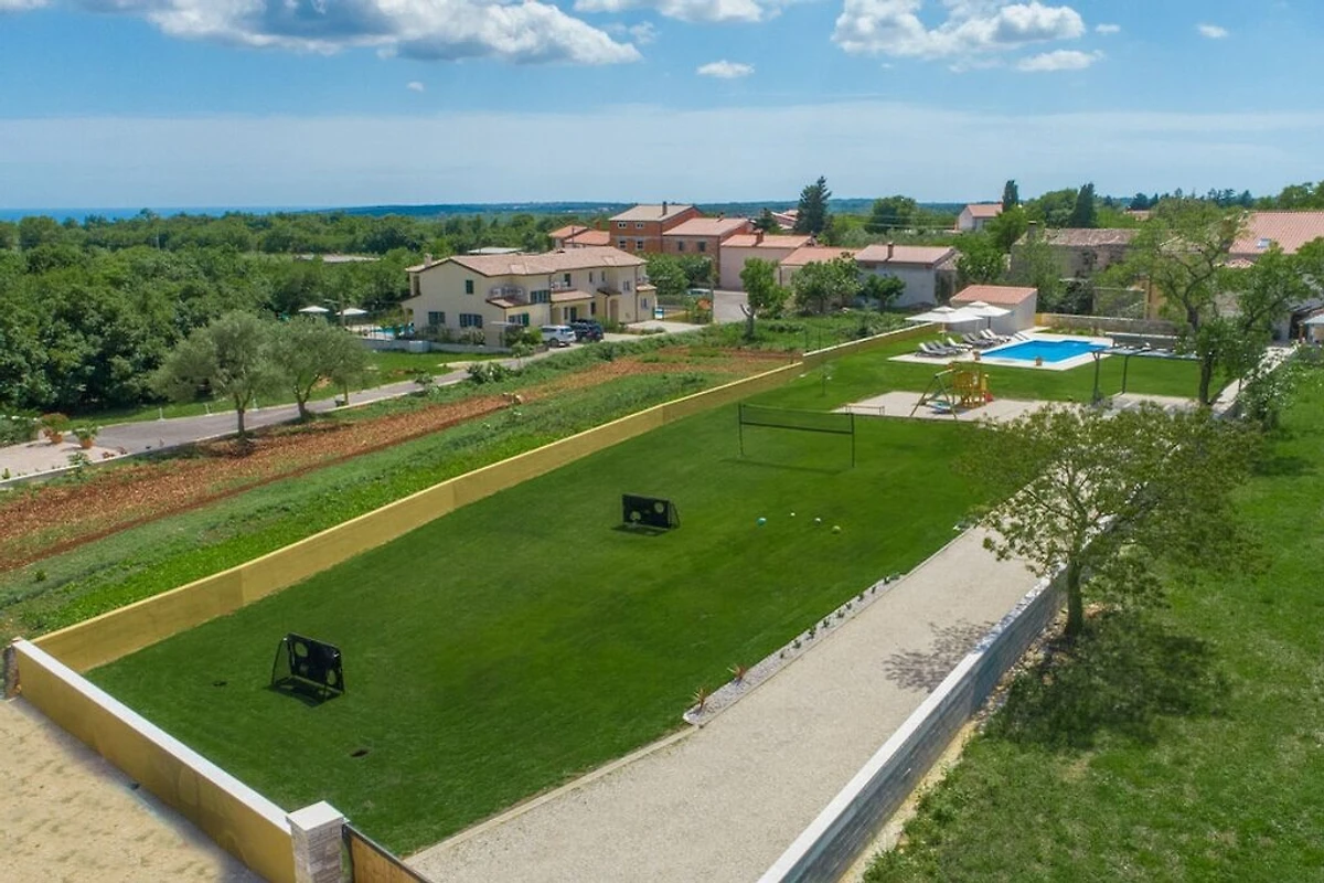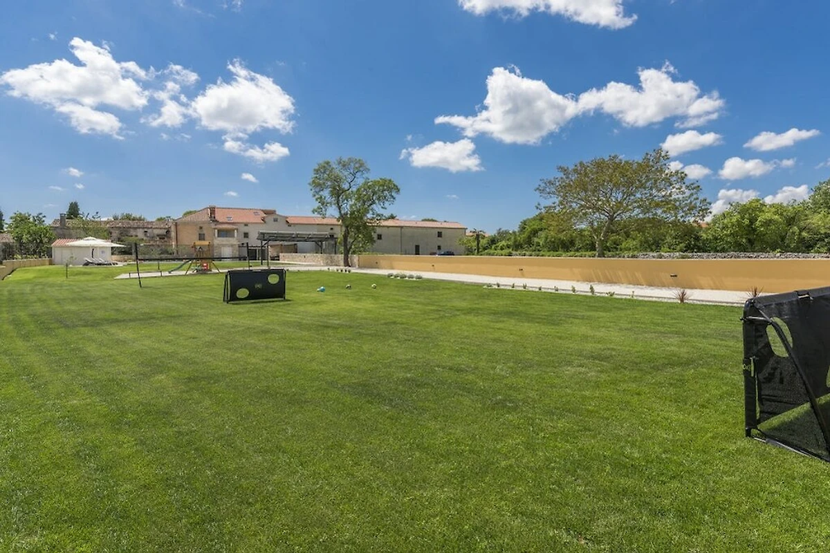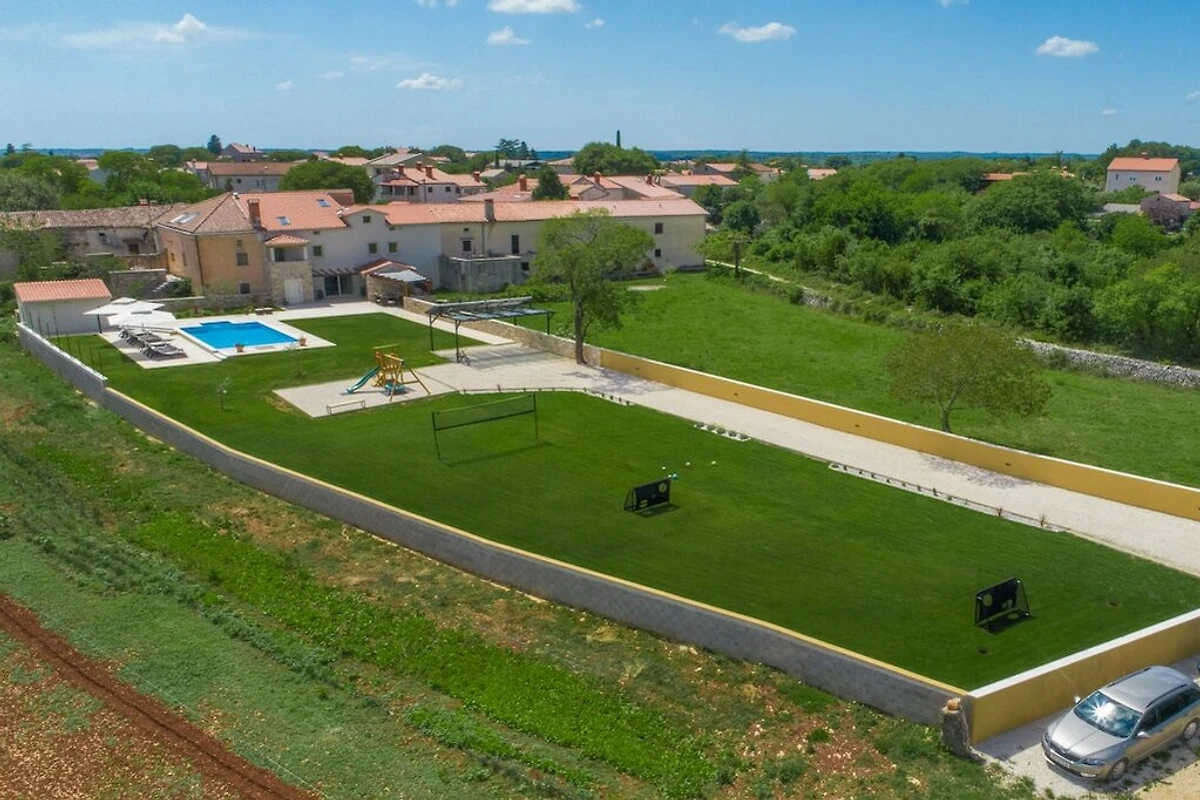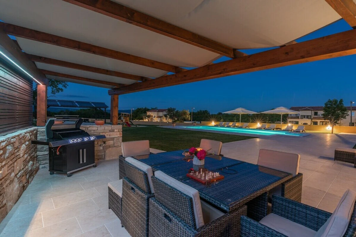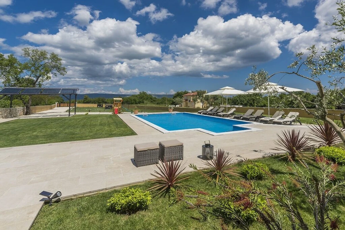 Das Ferienhaus Villa Ana hat eine Ausenanlage wo cca 2000m2 worauf sich ein Parkplatz, im vorderen Bereich ein Pool 50m2 mit einer schönen Liegefläche (Liegestühle) einer Terrasse mit Möbel, Schirm und ein Grill befinden.