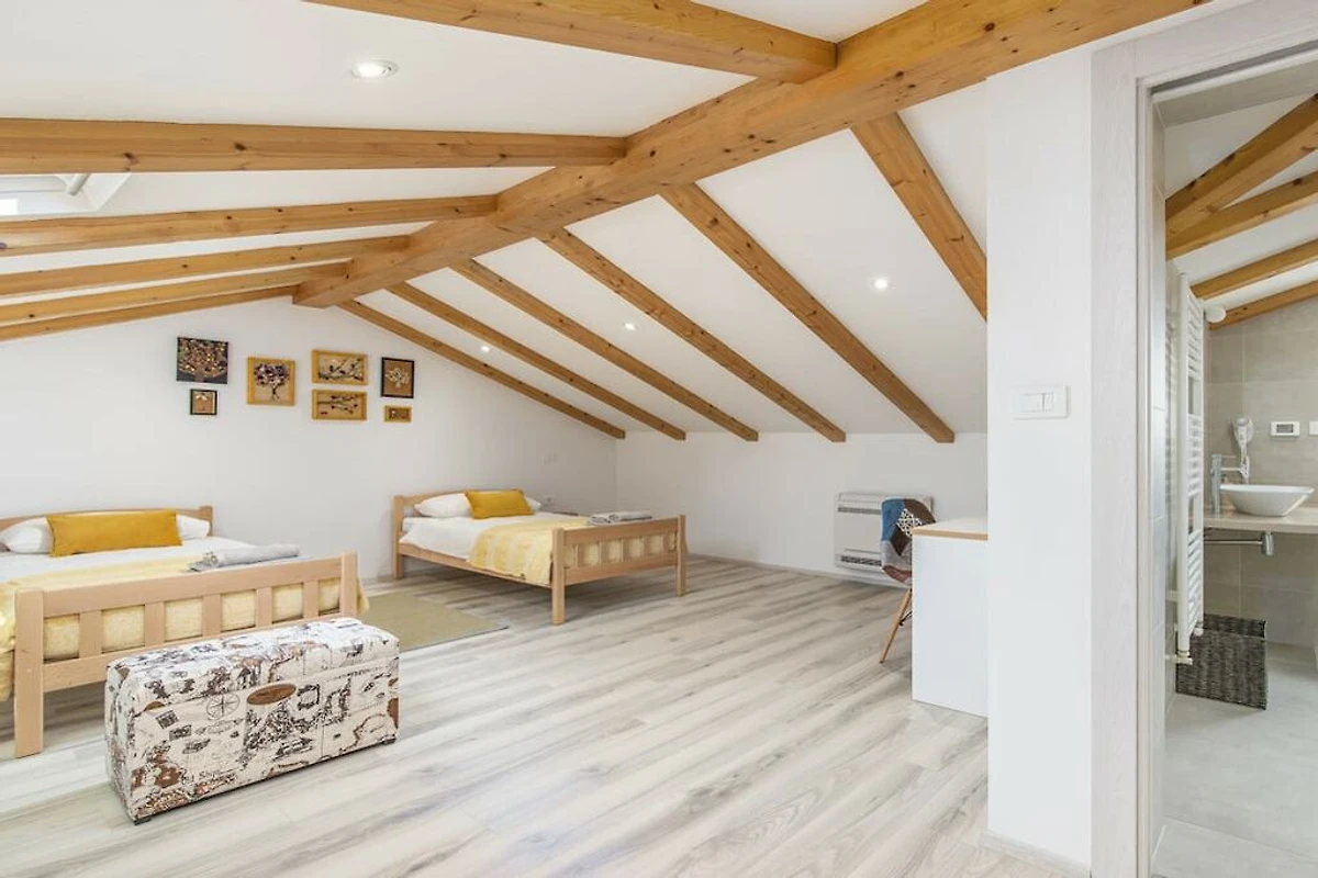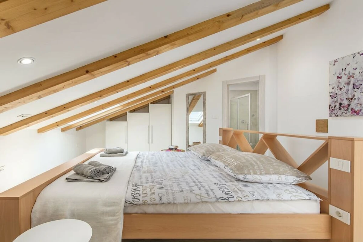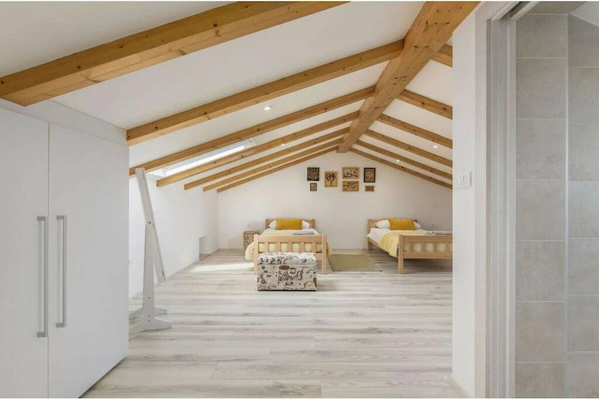 Dachgeschoss: (Schlafzimmer(, , , , Einzelbett, Einzelbett, TV, Heizung, Klimaanlage), Schlafzimmer(, , Doppelbett, Heizung, Klimaanlage), Badezimmer(, Toilette, Dusche, Waschbecken, Heizung, Föhn), Badezimmer(, Toilette, Dusche, Waschbecken, Heizung, Föhn))