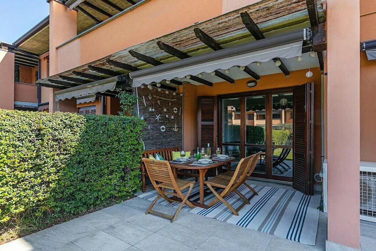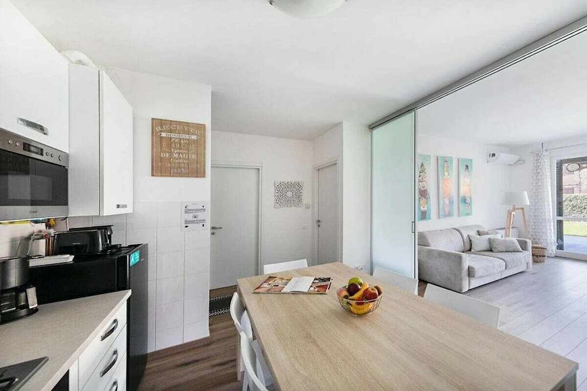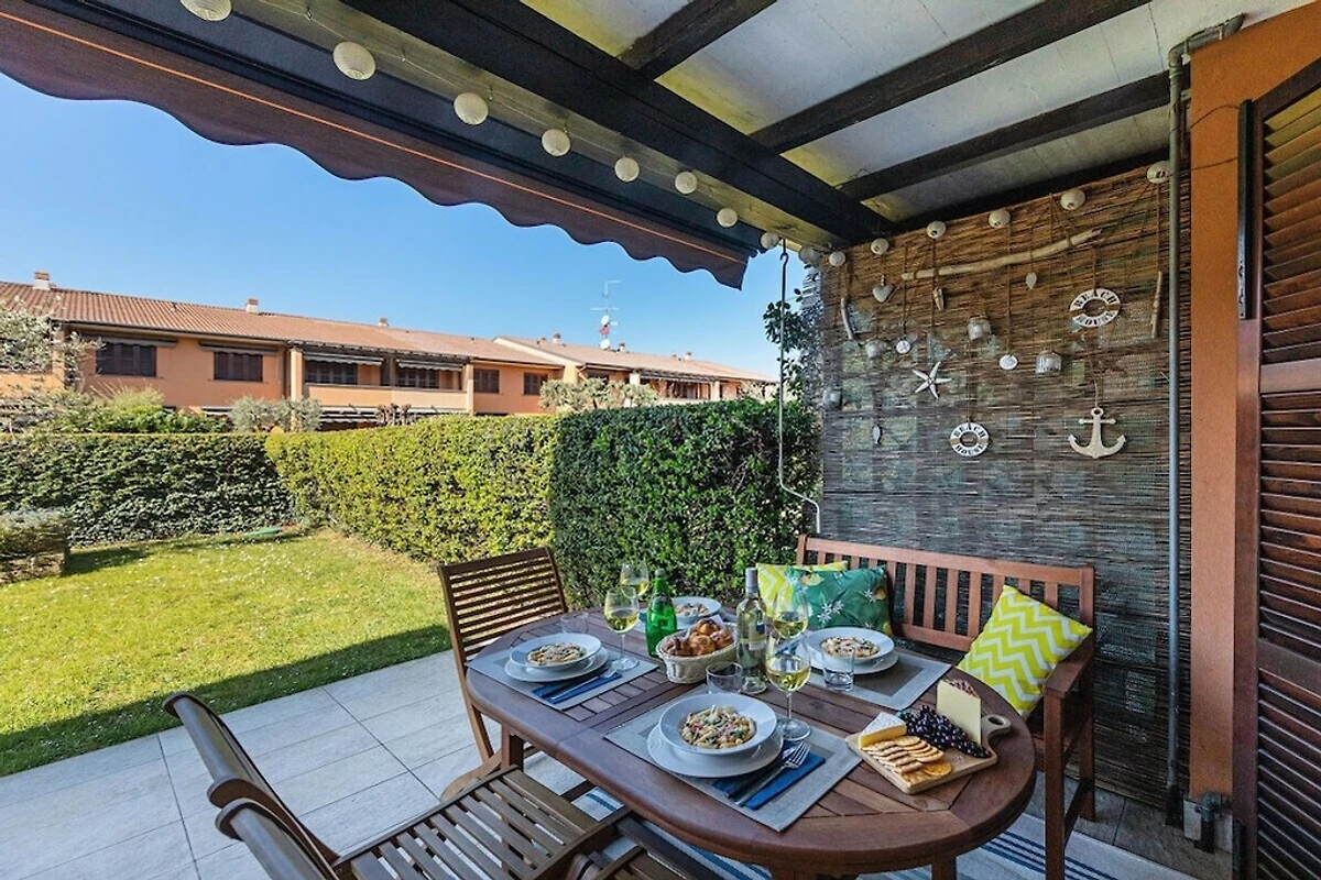 Von dem Wohnzimmer geht man auf die Terrasse, die mit einem Tisch und Stühle ausgestattet ist, zum Frühstücken und Abendessen im Freien; Ein schöner Garten gehört zu der Wohnung.