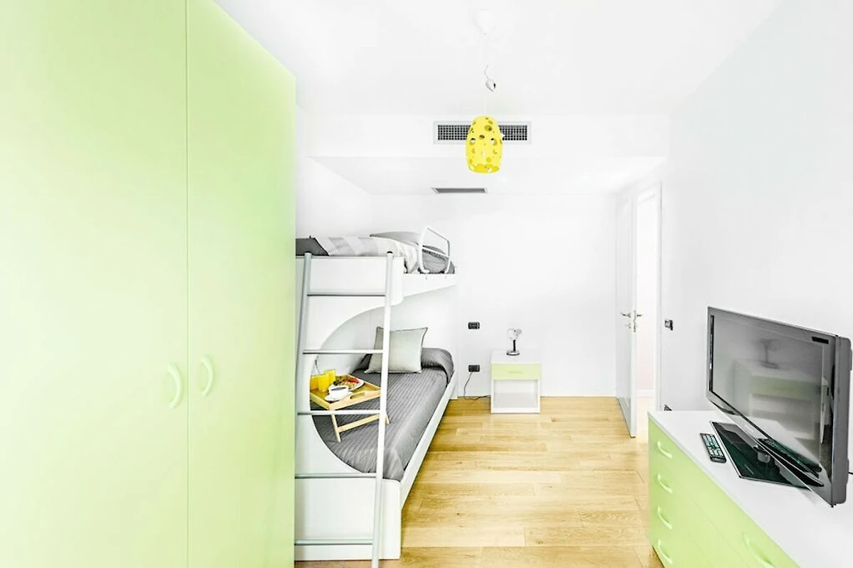 Diese helle und haustierfreundliche Wohnung, begeistert weiterhin mit dem bezaubernden Hauptschlafzimmer, dieses Zimmer verfügt über Kleiderschrank, Nachtischen und Doppelbett (hier kann Ihnen bei Bedarf ein Babybett mit einem kleinen Preiszuschlag bereitgestellt werden) und das zweite Schlafzimmer mit Etagenbett. Ein schönes Badezimmer mit Dusche, Waschbecken, Wc und Bidet ergänzt die Einrichtung diese sorglosen Rückzugsortes.