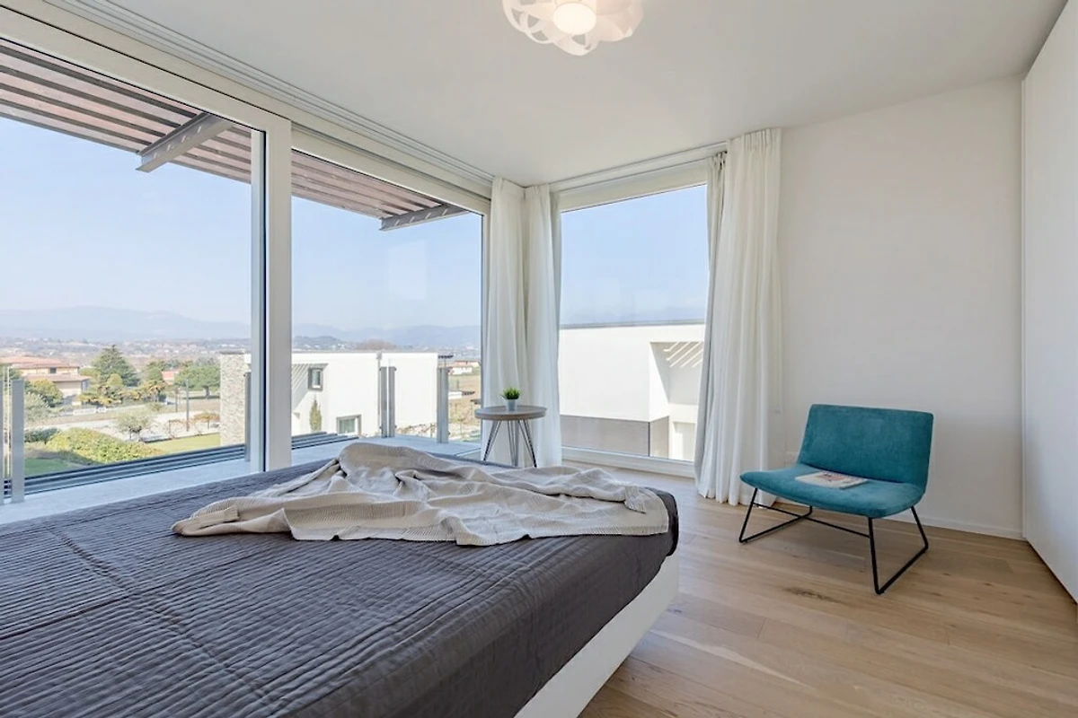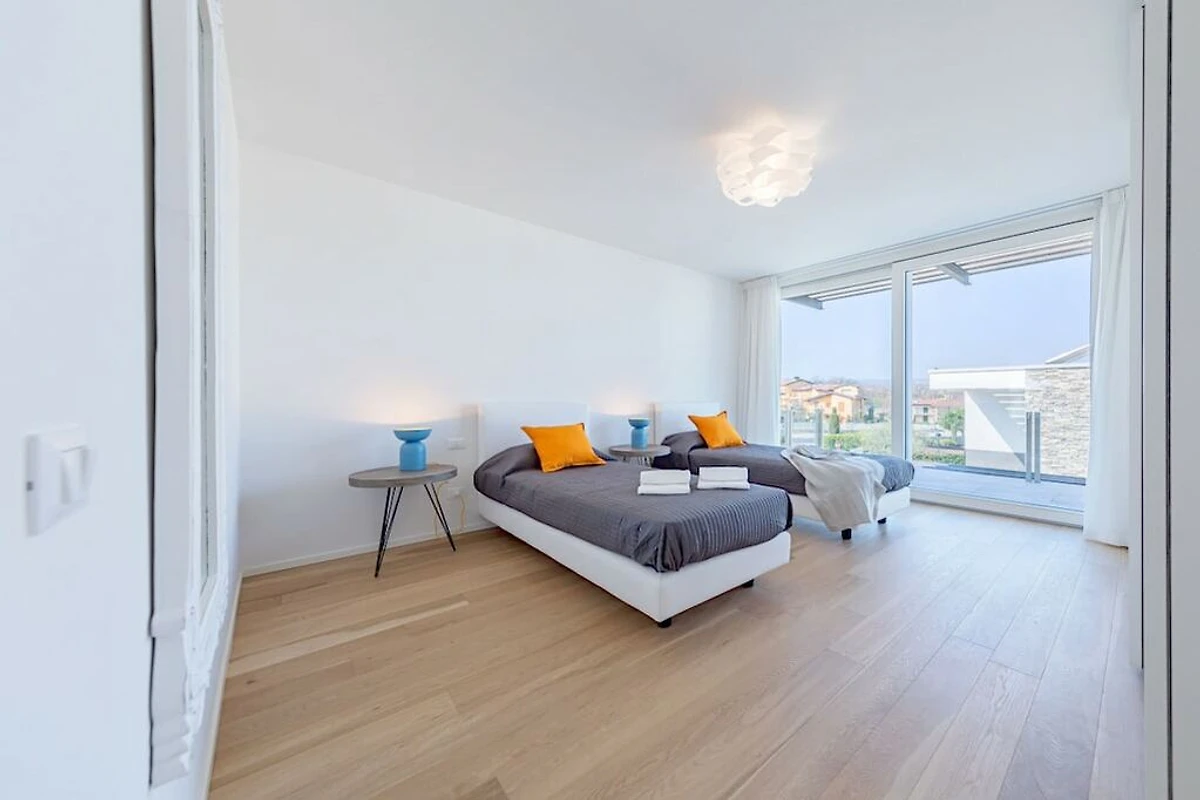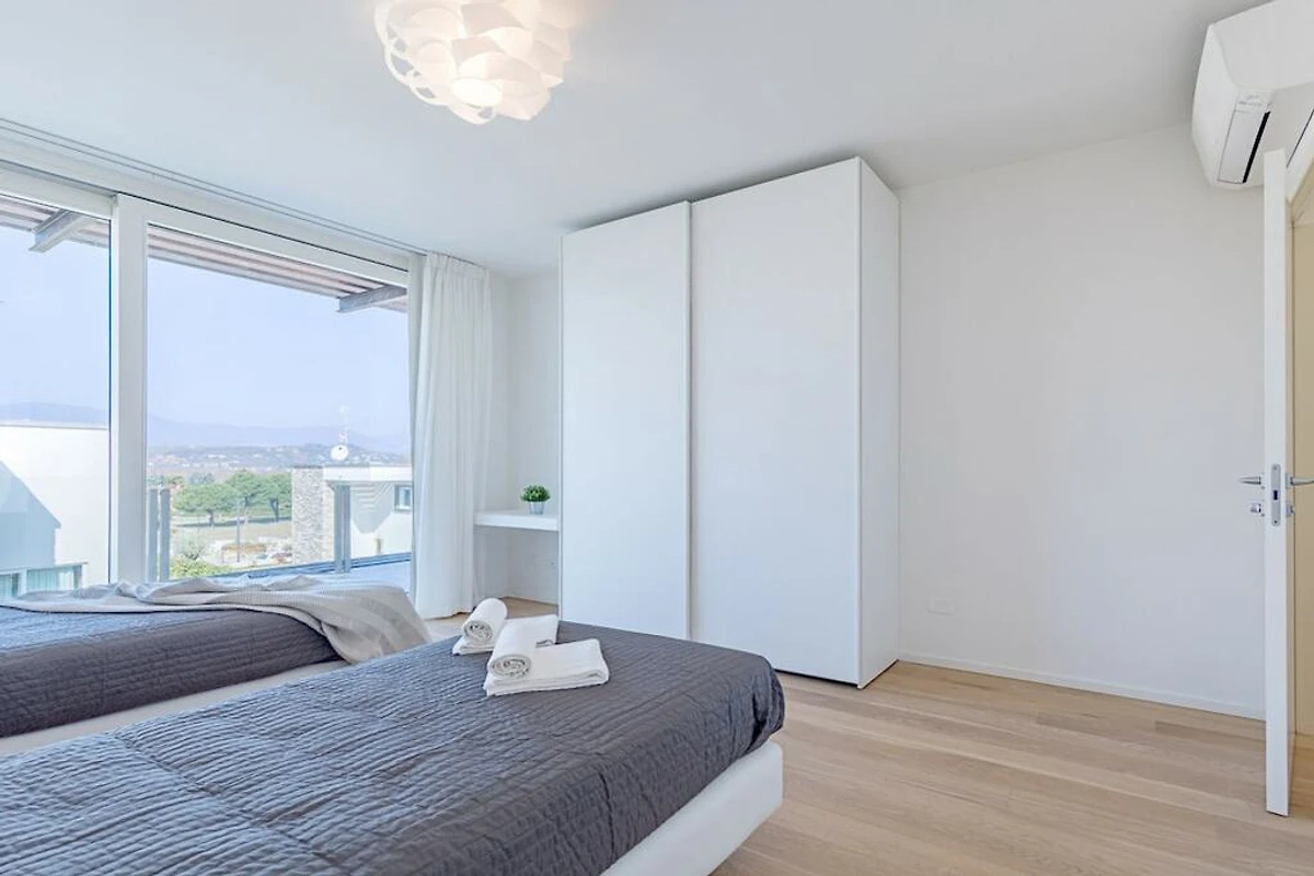 Das erste Schlafzimmer ist ausgestattet mit einem Doppelbett, Schränken und einen Balkon mit Blick auf den See;