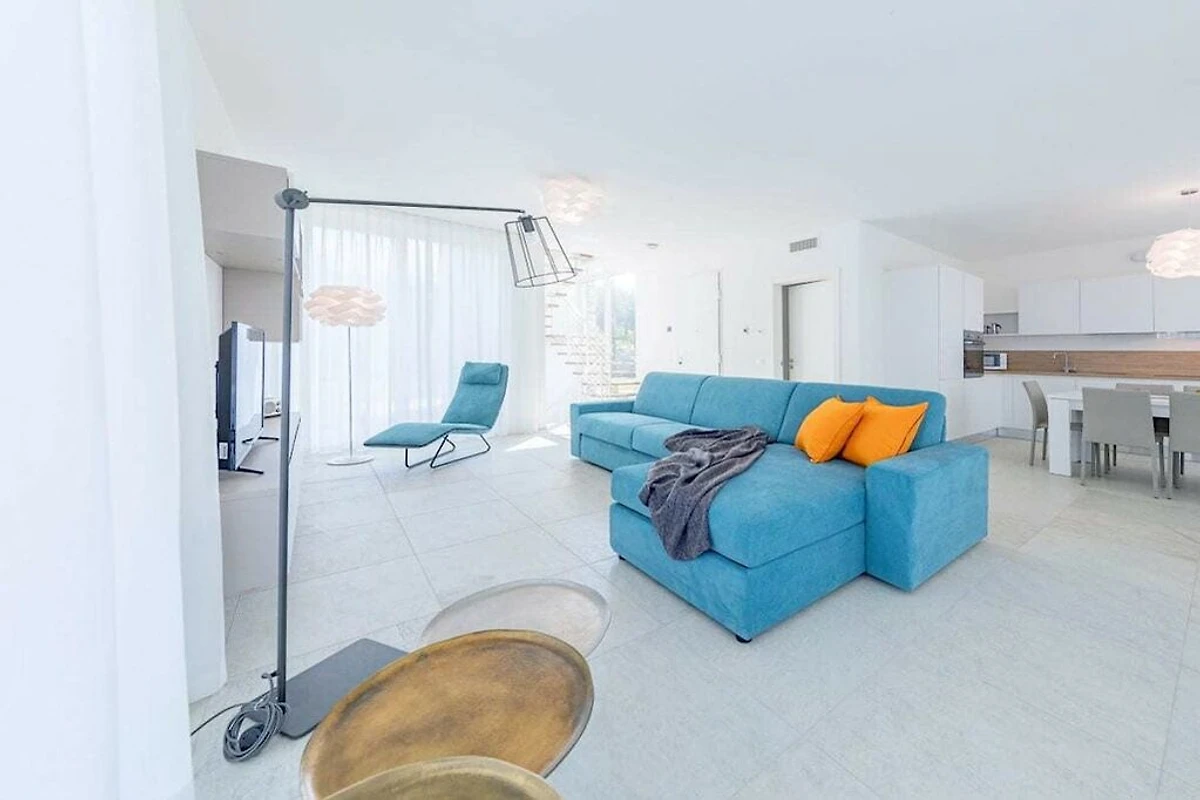 Von dem Wohnzimmer aus geht man auf die Terrasse, auf den Garten und auf den Pool wo an sonnigen Tagen kann man auch den Tisch und die Stühlen im Außenbereich nutzen um an der frischen Luft zu entspannen.