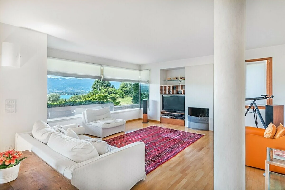 Vom Wohnzimmer aus blickt man durch ein Fenster auf die schöne überdachte Terrasse mit einer kleinen Entspannungsecke mit Sofas und einem Esstisch mit Stühlen, ideal für Frühstücke und Abendessen im Freien, die durch einen herrlichen Blick auf den See bereichert werden.