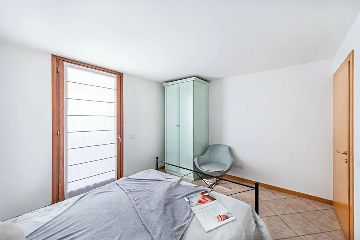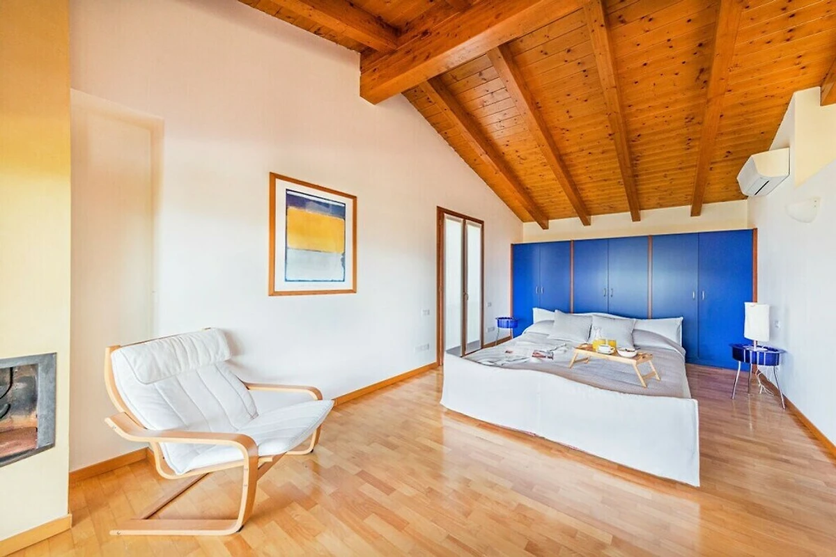 Im Erdgeschoss befindet sich eine große Suite, ausgestattet mit einem Doppelbett, Sofa, Sessel und Schränken, die über ein eigenes Bad mit Dusche, Waschbecken, Bidet und Toilette verfügt.