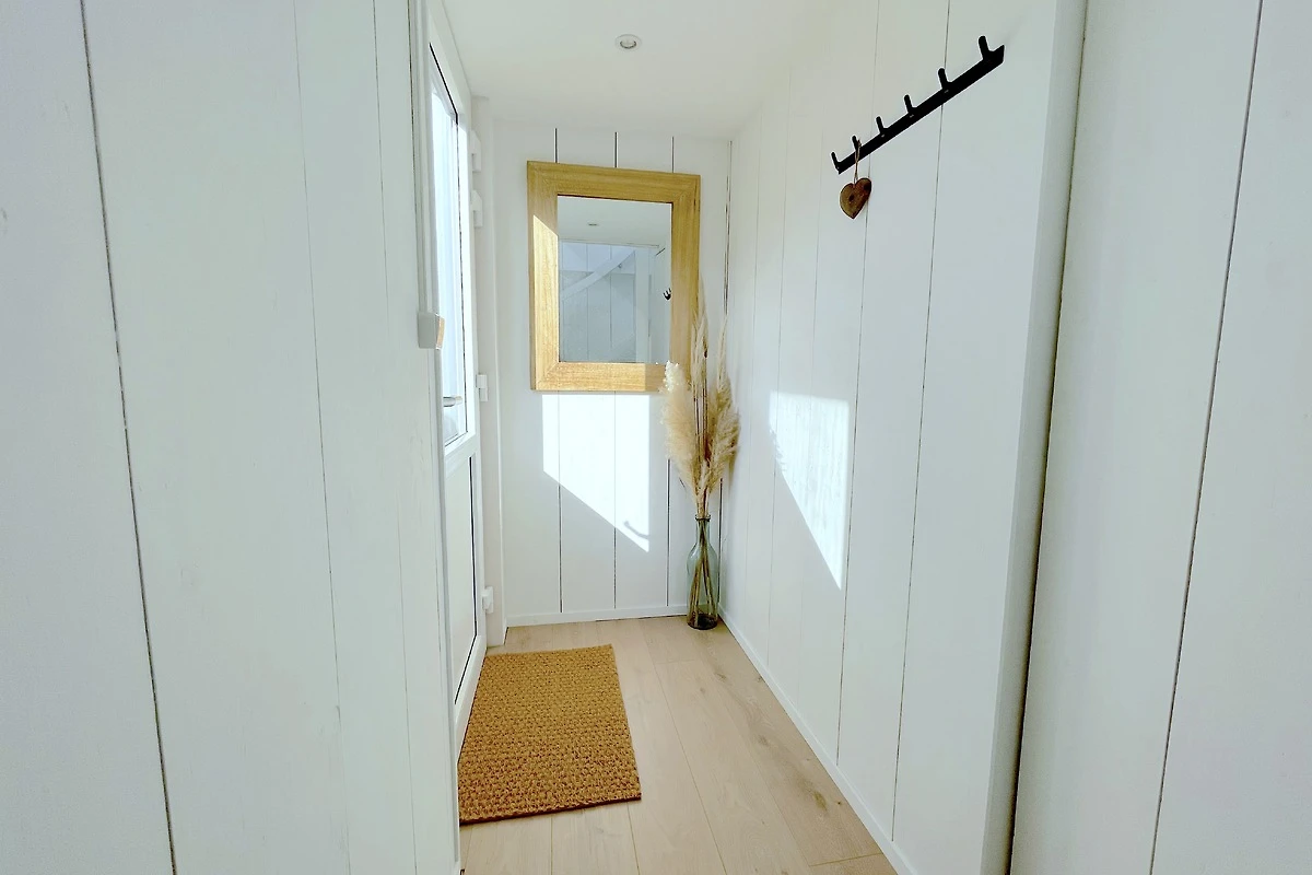 Beim Betreten betreten Sie den hellen, kompakten Flur, in dem sich eine Garderobe mit einem großen Spiegel befindet.