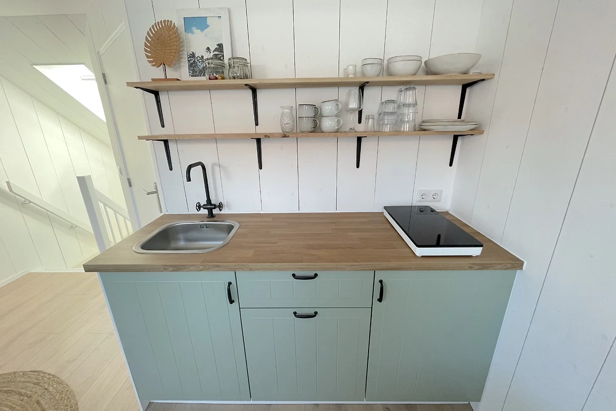 Über die Treppe gelangen Sie in den ersten Stock. In diesem offenen Raum sind die Küche, der Essbereich und das Doppelbett (160x200) zusammen praktisch aufgeteilt. Die Küche ist mit einem 2-Flammen-Induktionskochfeld, Geschirr, Mikrowelle, Nespresso-Kaffeemaschine, Kühlschrank mit Gefrierfach, Wasserkocher und Toaster ausgestattet.