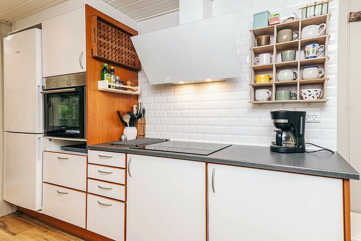 , Küche(Kochherd(2 Kochplatten), Kaffeemaschine, Backofen, Mikrowelle, Spülmaschine, Kühlschrank(+ Gefrierfach), Trockner, Waschmaschine), Wohn-/Schlafzimmer(TV(Deutsch Fernsehsender, dänische Fernsehsender, norwegische Fernsehsender, schwedische Fernsehsender), Chromecast), Wohn-/Schlafzimmer(Hochstuhl), Schlafzimmer(Doppelbett), Schlafzimmer(Doppelbett), Schlafzimmer(2x Einzelbett), Badezimmer(Waschbecken, Dusche, Toilette), Heizung(elektrisch), Terrasse, Gartenmöbel, Liegestühle, Spielgeräte, Luft-Luft-Wärmepumpe