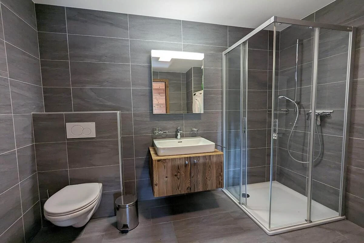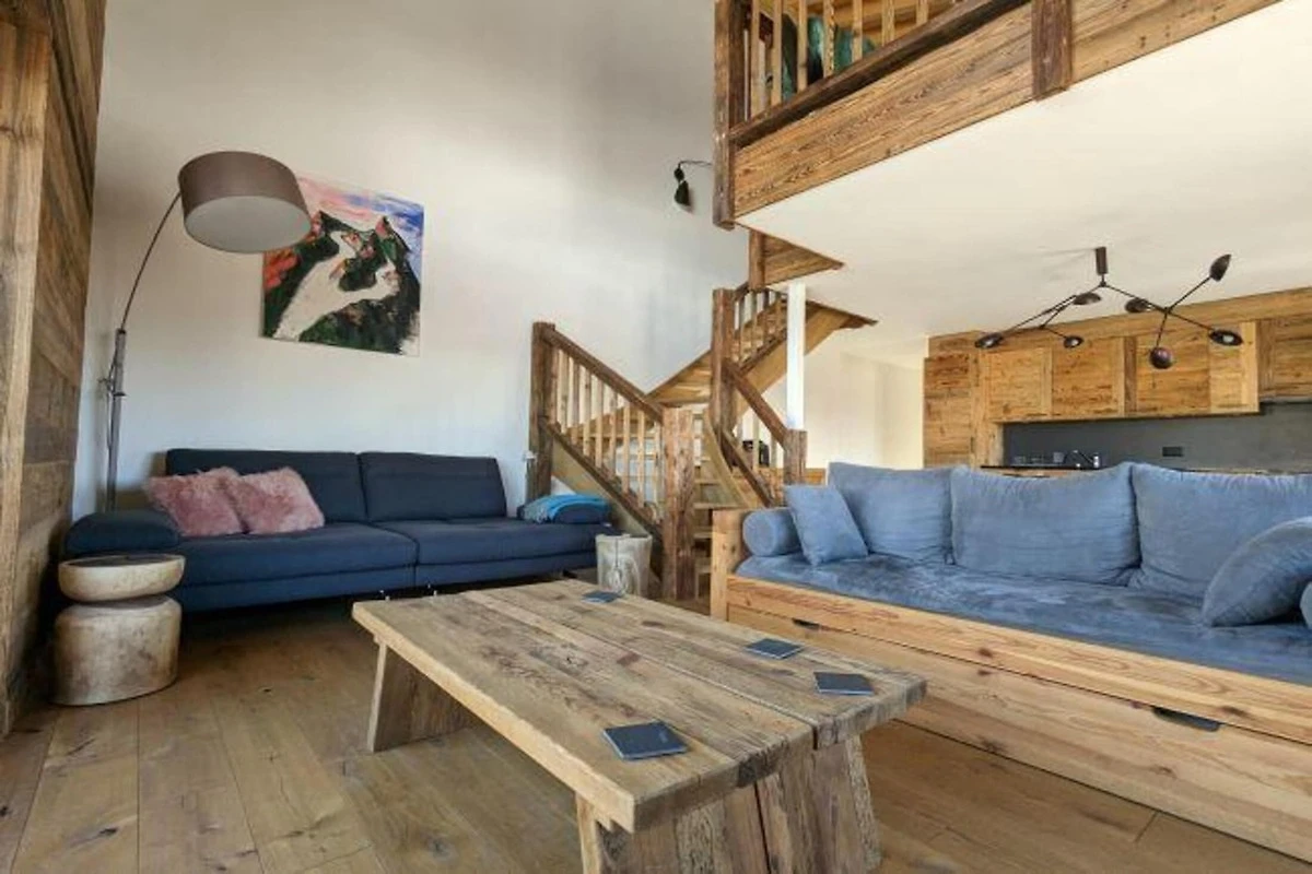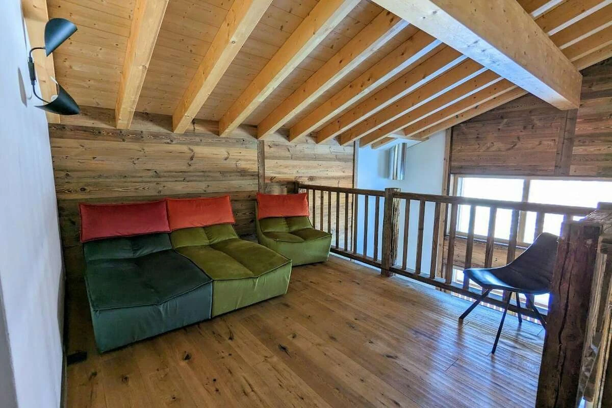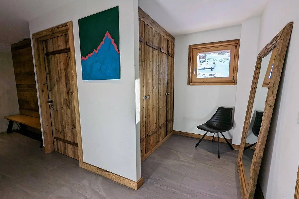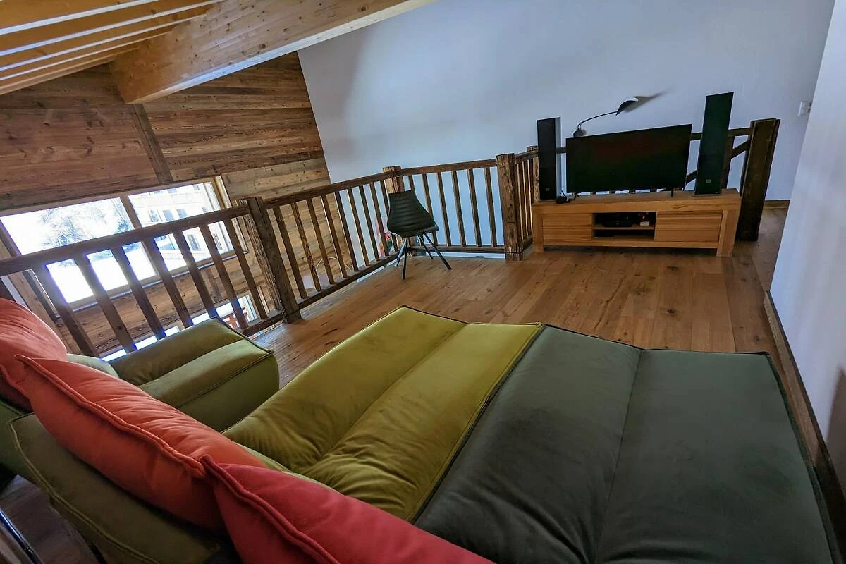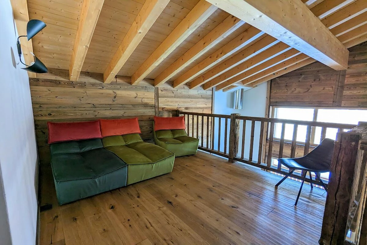 Im Obergeschoss bietet das Zwischengeschoss ein zweites Wohnzimmer mit einem Streaming-fähigen Fernseher und einer hochwertigen Musikanlage – ideal für entspannte Abende. Das Apartment verfügt über vier Schlafzimmer mit je zwei Einzelbetten (90 x 200 cm) und ein Schlafsofa für zwei Personen im Hauptwohnbereich. Fünf Badezimmer – vier mit Dusche und eines mit Badewanne – garantieren Komfort und Bequemlichkeit. Zu den weiteren Annehmlichkeiten gehören ein Skiraum, eine Waschmaschine, ein Trockner und ein überdachter Parkplatz (weitere können gemietet werden).