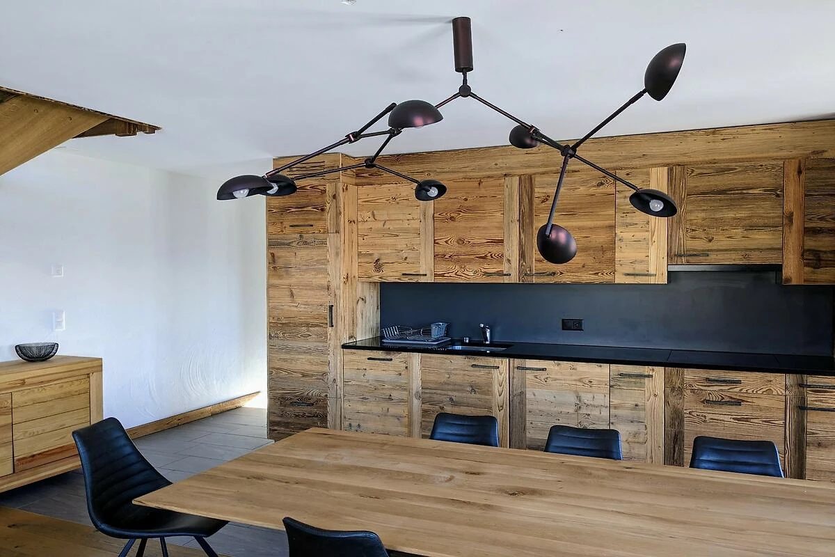 Exzellente Aussicht über das Rhone Tal, Sehr zentral zu allem (Gondel, Restaurants, Geschäfte), Der Küchen-/Wohn-/Essbereich unter dem hohen Dachgiebel ist wunderbar,