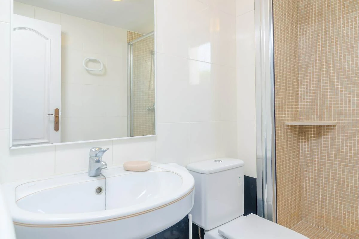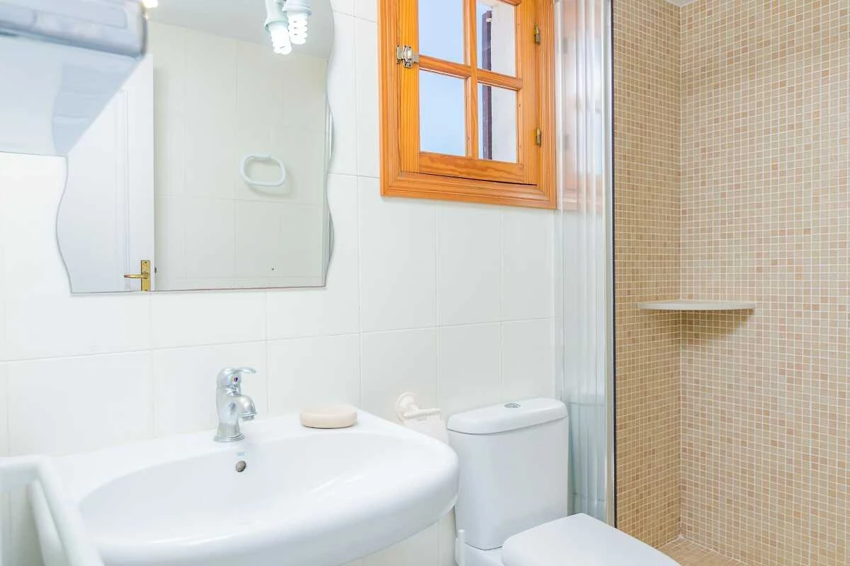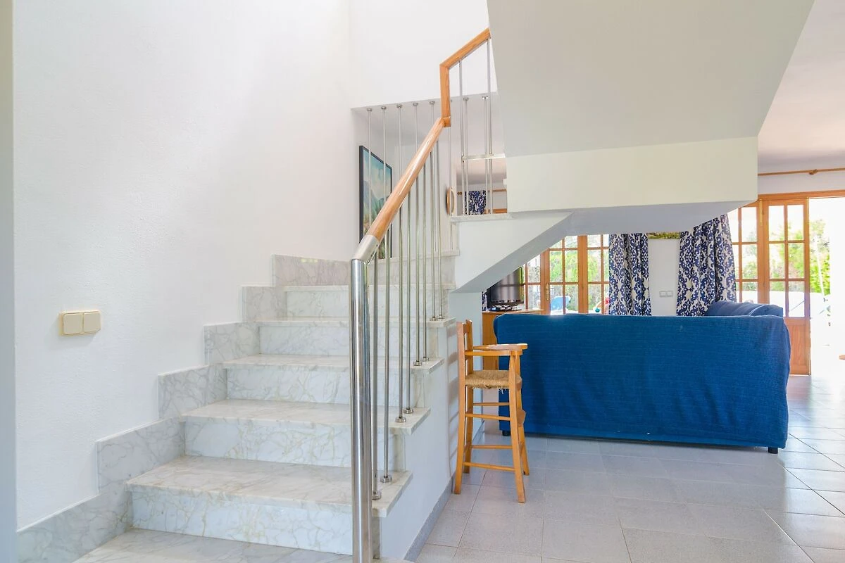 Im Inneren des Ferienhauses herrscht ein mediterranes Flair vor, wobei sich die Räumlichkeiten auf 250m2 und zwei Wohnebenen verteilen. Das klimatisierte Wohn-Esszimmer mit Satellitenfernsehen befindet sich, gleich wie die komplett ausgestattete Küche mit Ceranfeld, im Erdgeschoss. Zwei der vier Schlafzimmer sowie ein Duschbad liegen ebenfalls unten. Beide haben je zwei Einzelbetten, einen Schrank und Klimaanlage. Die anderen beiden klimatisierten Schlafräume befinden sich im ersten Stock. Das erste wartet mit einem Doppelbett, Schrank und privatem Duschbad auf, während das zweite über zwei Einzelbetten, Schrank und Zugang zur oberen Terrasse verfügt. Ein weiteres Duschbad steht dem ersten Stock zur Verfügung. Ein Babybettchen und ein Hochstuhl werden gerne auf Anfrage vorbereitet. Selbstverständlich bietet das Haus eine Waschmaschine, ein Bügeleisen und ein Bügelbrett.