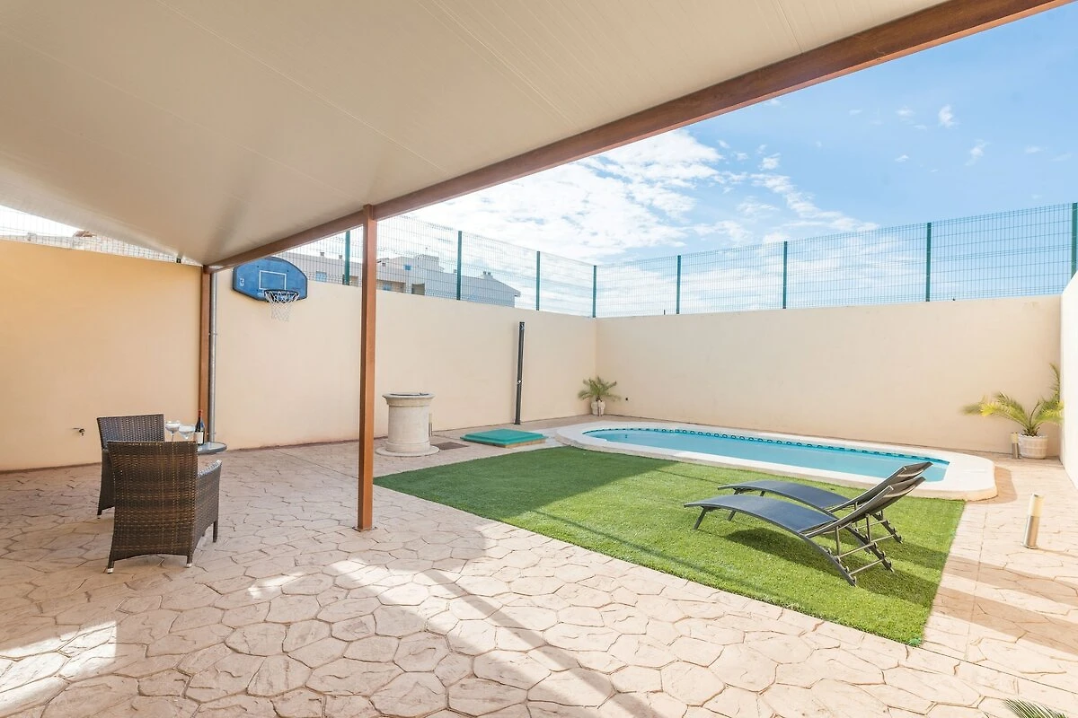 Das Haus hat 2 Apartments; nur die Erdgeschosswohnung steht zur Vermietung; das Obergeschoss ist verschlossen und unbewohnt. Der Pool und die Terrasse sind somit komplett privat. Im 6m x 3m großen Pool können Sie sich schon morgens ein erfrischendes Bad gönnen. Der Pool ist zwischen 1.4m und 1.6m tief und wird mit Chlor sauber gehalten. Eine Liege lädt zum ausgiebigen Sonnenbaden ein und zwischendurch kann man sich an der Außendusche abkühlen. Die Terrasse ist ein schönes Plätzchen für ein romantisches Abendessen zu zweit oder zum Grillen am Nachmittag. Das Grundstück ist umzäunt und es gibt direkte Nachbarn.