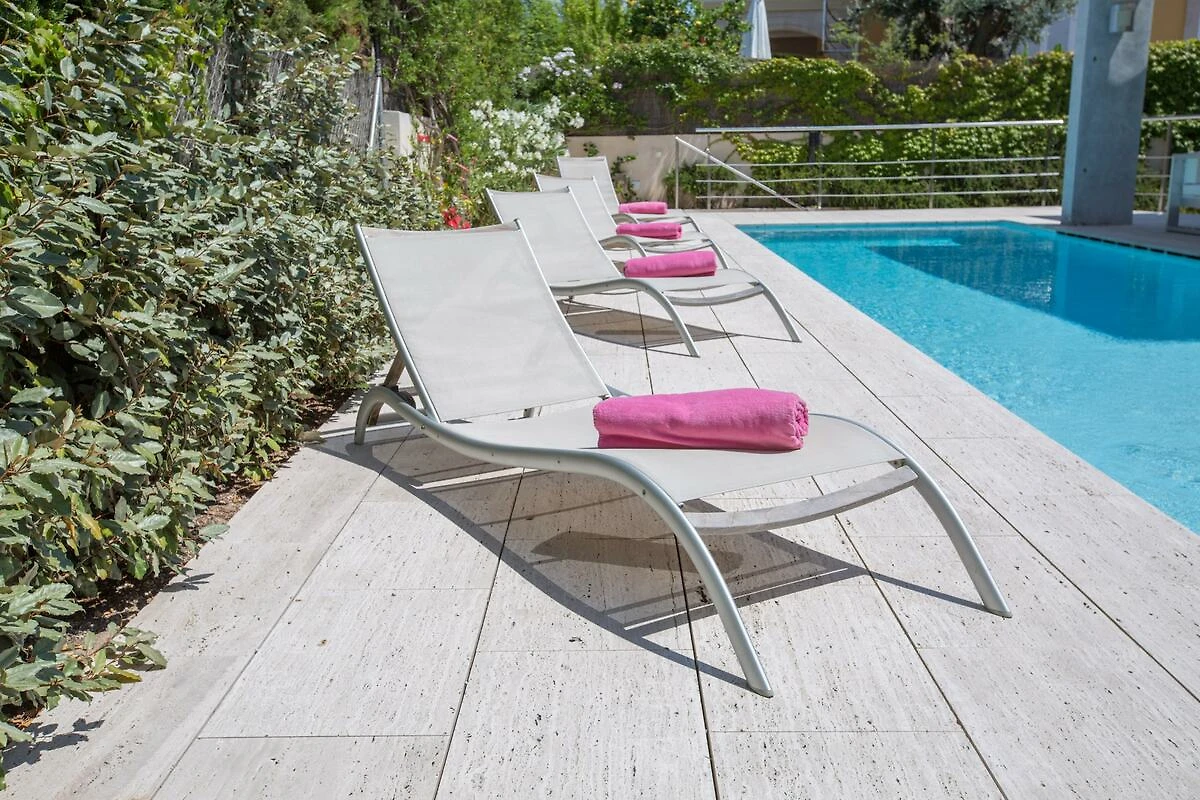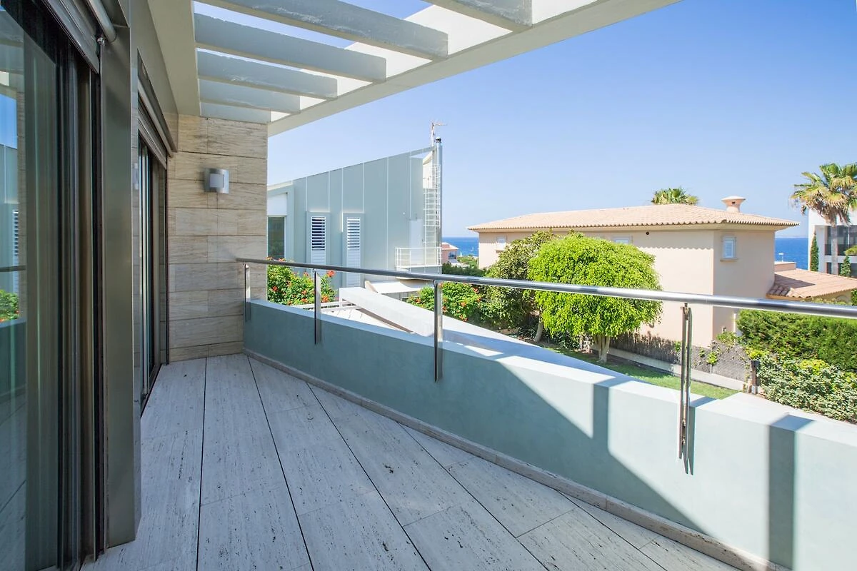 Neben der Veranda liegt der 12,5 x 3,5 m grosse Salzwasserpool (Wassertiefe von 0,70 – 1,85m), umgeben von 8 Sonnenliegen, auf denen Sie die Sonne Mallorcas geniessen können. Im Poolbereich befindet sich eine Aussendusche. Dank des mobilen Grills können Sie jede Ecke der Aussenanlage für ein Barbecue mit Freunden und Familie nutzen. Zum Garten gehören eine weitere Terrasse und eine 90 m2 grosse Rasenfläche. Sowohl 2 Schlafzimmer der ersten, als auch ein Schlafraum der zweiten Etage, haben Zugang zu weiteren Terrassen. Von der 50 m2 grossen Terrasse im Obergeschoss haben Sie einen fantastischen Ausbick auf das Dorf und das Meer.