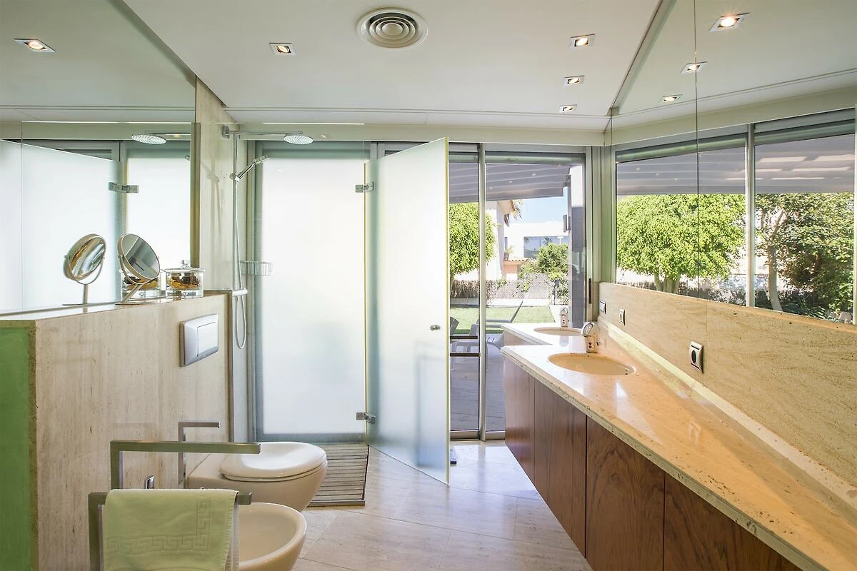 Die ca. 72 m2 grosse Veranda mit beeindruckender Glasfront erstreckt sich über die gesamte Länge des Erdgeschosses. Vom Wohn-, Essbereich, der Küche und einem der Schlafzimmer hat man direkten Zugang zu dieser Veranda. Sie ist in mehrere Bereiche geteilt: tagsüber, zum Entspannen oder für den Aperitif, bieten sich die bequemen Sitzgelegenheiten unter dem Sonnenschutz an. Am Abend können Sie mit Ihren Lieben gemeinsam im schönen Essbereich speisen, während vom Meer eine salzige Brise heraufweht.