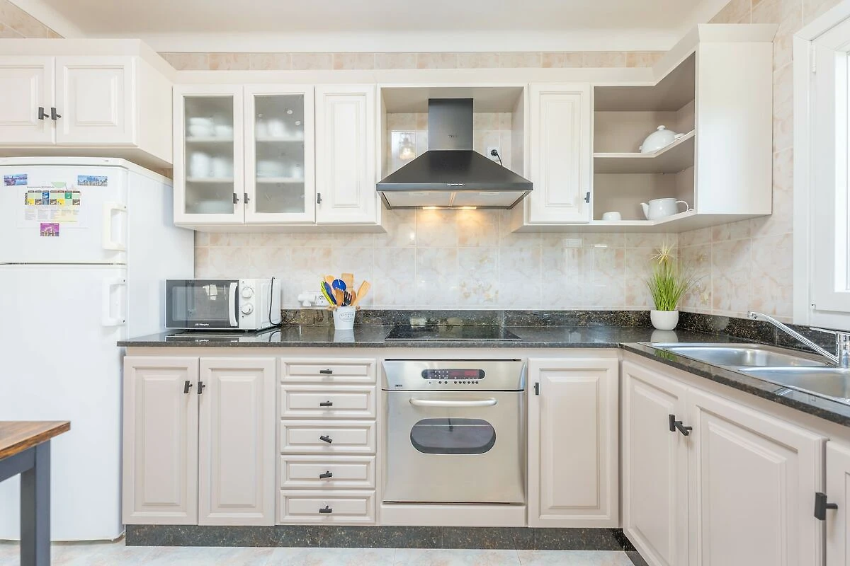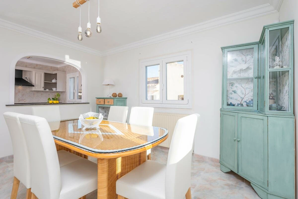Auch der mediterran eingerichtete Innenbereich kann sich sehen lassen! Bei einem guten Film im Satellitenfernsehen oder der Lieblings-CD lässt man auf dem Sofa im Wohnzimmer die Seele baumeln. Rund um den Esstisch nimmt die Familie Platz und tauscht alle Neuigkeiten des Tage aus. Das Kochen macht in der gut ausgestatteten Küche mit Cerankochfeld so richtig Spass. Auch eine Waschmaschine, Bügeleisen, Bügelbrett und Trockner fehlen hier nicht.