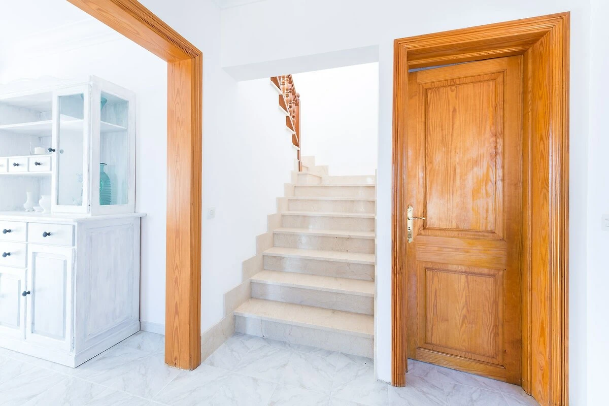 Das Innere ist schlicht eingerichtet, hell und geräumig. Das Wohn- und Esszimmer hat direkten Zugang von der Terrasse, wo Sie gemeinsam mit Ihren Begleitern Mahlzeiten genießen können, während Sie einen Film über Satellitenfernsehen ansehen oder Musik hören. Die Küche verfügt über ein Induktionskochfeld und ist mit allen notwendigen Utensilien ausgestattet, damit Sie Ihre Lieblingsgerichte zubereiten können. Es gibt eine Waschmaschine, ein Bügeleisen und ein Bügelbrett. Auf derselben Etage befindet sich ein Schlafzimmer mit Doppelbett sowie ein Badezimmer mit Badewanne. Über die Treppe gelangen Sie zu drei weiteren Schlafzimmern: zwei mit Doppelbett und eines mit zwei Einzelbetten. Ein Badezimmer mit Badewanne vervollständigt diese Etage. Bitte beachten Sie, dass zwei der Schlafzimmer keinen Kleiderschrank, sondern eine Kleiderstange haben. Wenn Sie mit Ihrem Baby reisen, können wir Ihnen ein Kinderbett und einen Hochstuhl zur Verfügung stellen. Außerdem gibt es zwei Ventilatoren, die Sie nach Belieben aufstellen können.